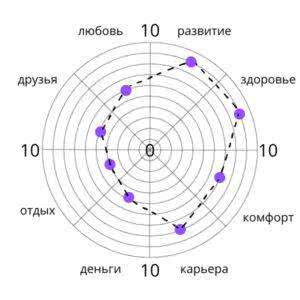 «Колесо» — это круг, обычно разбитый на восемь сегментов (но может быть и до 12), где каждый сегмент или спица представляет аспект жизни. В каждом сегменте вы набираете 0-10 очков, причем 0 находится в центре колеса, а 10-за пределами круга. Достижение внешнего края круга или колеса означает полное удовлетворение в этой зоне.