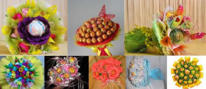 Перечень вышеперечисленных материалов является приблизительным, по своему усмотрению, изучив разнообразные фото букетов из конфет, вы можете выделить для себя желаемые элементы оформления, и с их помощью выстроить эксклюзивную композицию. Для декорирования могут применяться бантики, бабочки, птички, ягодки, фрукты и т.д.