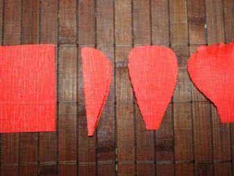 Прежде всего вырезают пару красных квадратов со стороной 6 см. Резать надо и зеленую бумагу: из нее нужно получить прямоугольник 7х6 см и небольшую (20х1 см) полоску. Этого количества деталей хватает для одного цветка. Необходимое количество комплектов можно рассчитать без всяких проблем. Квадраты красного цвета с одного края скругляют так, чтобы они были больше похожи на лепестки.