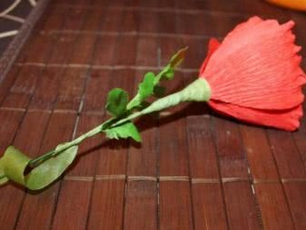 - Из фетра вырезать несколько листочков, скотчем прикрепить к стебельку, но лучше к основанию бутона.