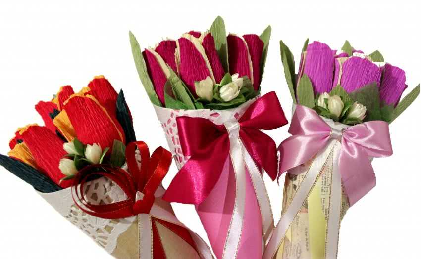 - Создать желаемое количество тюльпанов, сформировать из них букет, скрепить лентой.