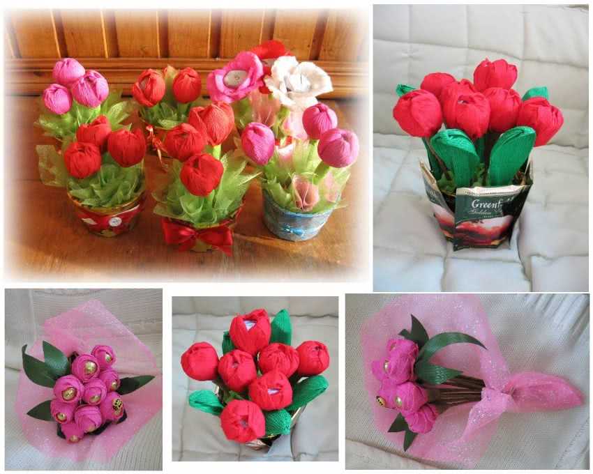 Неплохая детская поделка — букет на основе шоколадных батончиков. Каждый из батончиков необходимо прикрепить скотчем к продолговатой шпажке. Такое крепление производится с учетом центра тяжести, чтобы букет был устойчив. Когда все готово, можно выложить единую композицию. Рекомендации: