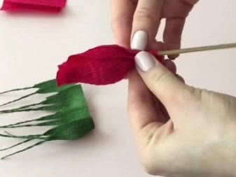 Из зеленой бумаги вырезаем небольшие кусочки шириной 0,7 см, высота около 10 см, концы закругляем ножницами. На каждый цветок понадобится 4-5 листочков, приклеиваем их к основанию цветка, чтобы листья были чуть повыше лепестков. Для реалистичности немного подкручиваем концы листочков. Шпажки до середины обматываем зеленой бумагой и закрепляем с помощью клея.