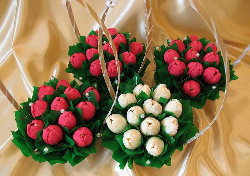 Дополнительно может пригодиться тейп-лента, искусственная зелень и оберточная бумага. Прежде всего делят проволоку на отрезки примерно по 25 см. В этом деле отлично помогают кусачки. Следующий шаг — приготовление трапеций из гофрированной бумаги. Они должны быть как минимум вдвое выше самих конфет, длина же — не менее 18 см.