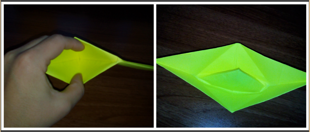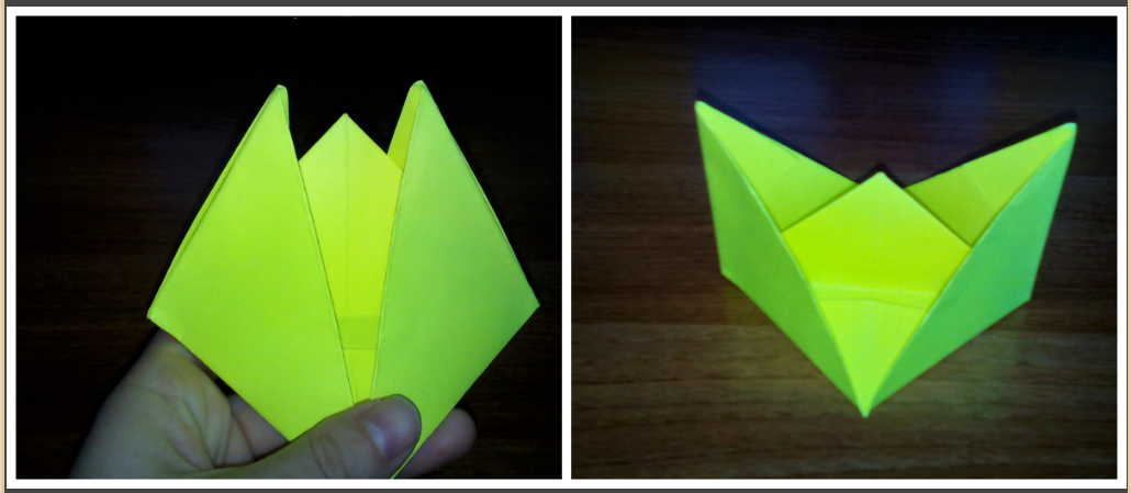 - По линиям сгиба, которые идут от центра нам нужно раскрыть поделку. Сначала левую сторону: открываем верхний угол, затем нижний, а потом толкаем правый бок к центру. Повторяем эти действия с правой частью поделки. Подробнее этот момент лучше посмотреть в нашем видео.