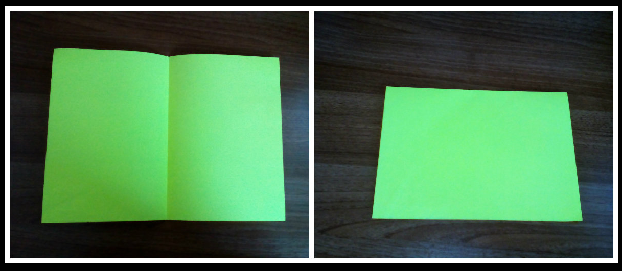 - Подготавливают квадрат из стандартного листа бумаги. Сгибают один раз пополам (получают прямоугольник) и сразу же еще раз пополам. Тщательно разглаживают сгибы. Разворачивают квадрат.