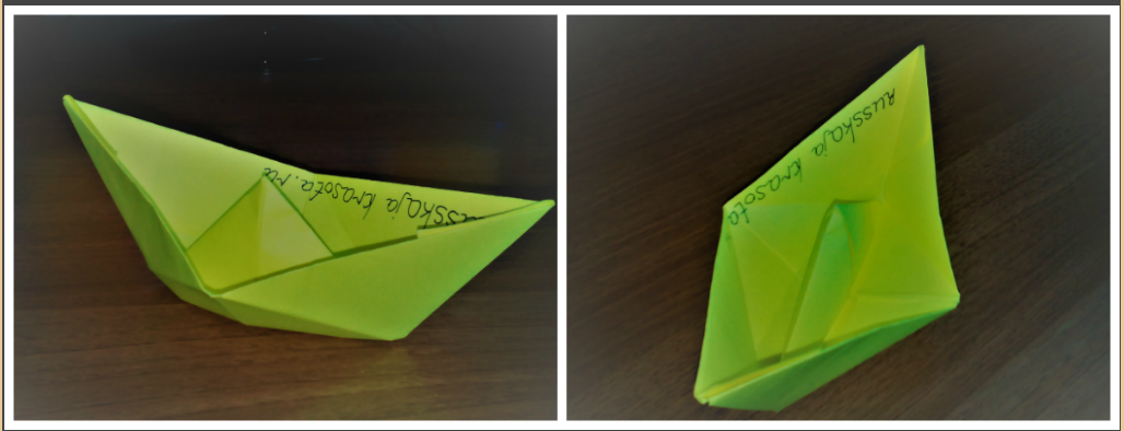 - Чтобы у кормы кораблик не расходился, вкладываем один угол в другой и плотно прижимаем. При желании можно смазать это место клеем. Готово!