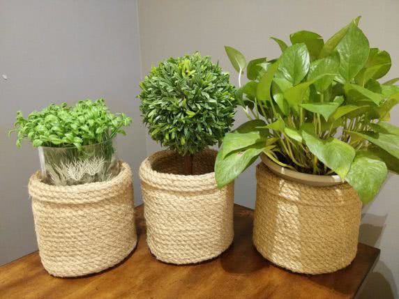 Если не уметете или не хотите вязать корзинку, то канат все равно является отличным материалом для корзинки. Его можно просто склеить с помощью горячего клея. Только выбирайте потолще.
