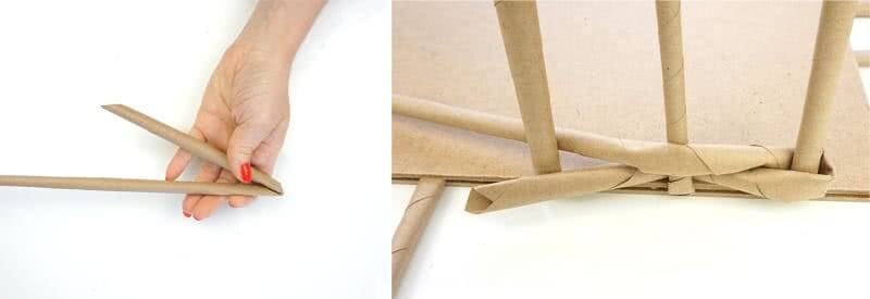 Далее трубочками оплетают край, чтобы не было видно картонного дна, поднимают стойки, ставят форму на дно и плетут вокруг макета выбранным типом плетения.