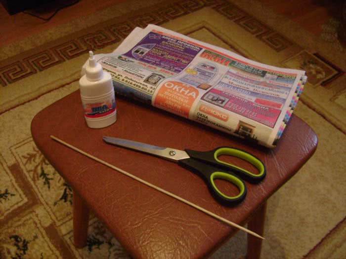 Нарезаем газеты или журнал полосками по 15 – 20 сантиметров в ширину. Можно использовать целый лист для трубочки. Вооружитесь спицей и клеем.