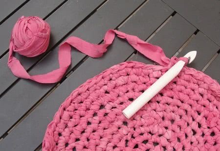 В третьем ряду сначала ввязывают по 2 столбика в первые 3 петли, затем один столбик в одну петлю, снова 3, потом опят 1. В четвертом еще меньше – сначала 2 петли с двумя столбиками в каждом, потом 1, затем снова 2. С помощью такого приема добиваются ровного и равномерно расширяющегося круга. Продолжают вязание, пока не достигнут желаемого размера. В конце закрепляют нитку, после чего проглаживают изделие с изнаночной стороны, чтобы коврик был ровным, не топорщился.
