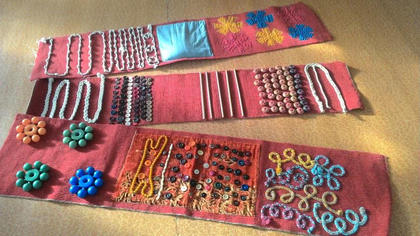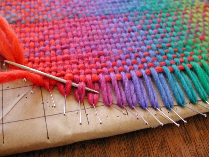 Подобным способом, чередуя расположение нитей, укладываются все последующие ряды до самого концаПосле завершения ткачества, нити основания связываются, их кончики прячутся в само изделиеНесколько примеров тканых половичков