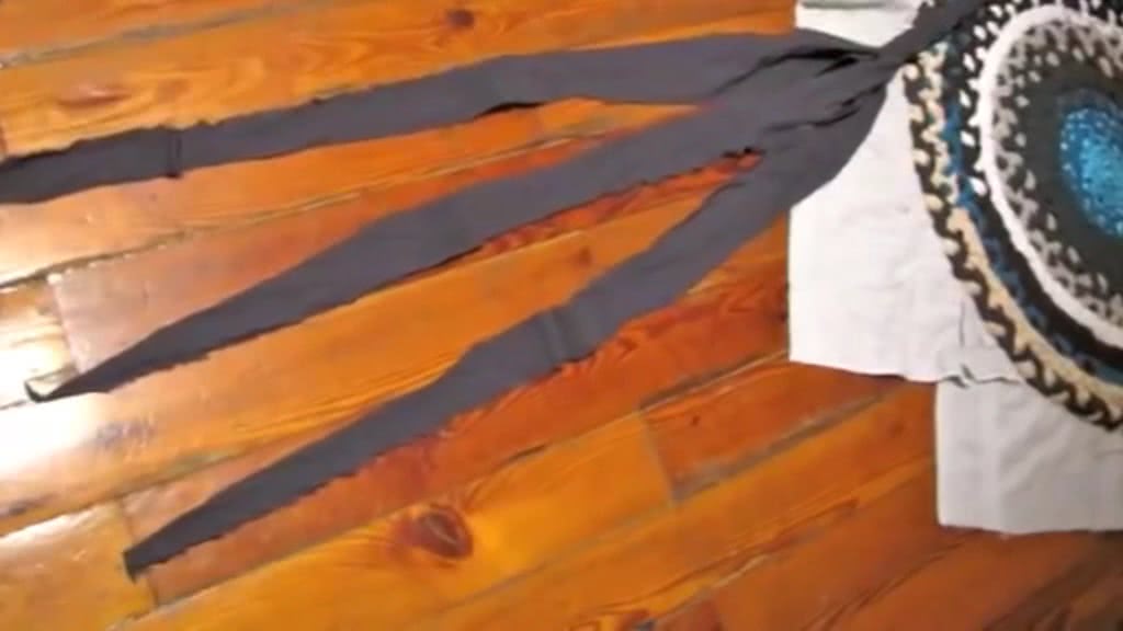 Нарезаем ленты из старых вещей: брюк, джинсов, пальто, курток, и так далее. Ленты должны быть шириной 5-6 см. 3 полоски сплетаем обыкновенной косичкой. Можно взять полоски одного или двух цветов.
