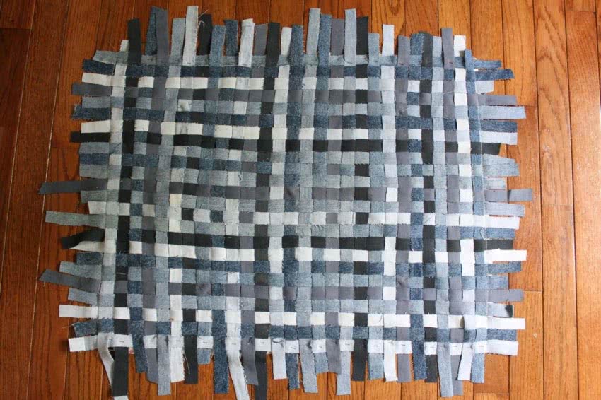 - Вплетите первую полосу таким образом: пропустите её под основой коврика, а затем над ней. Полоса должна располагаться вертикально по отношению горизонтальной основы и должна соприкасаться со всеми полосами основы будущего коврика.