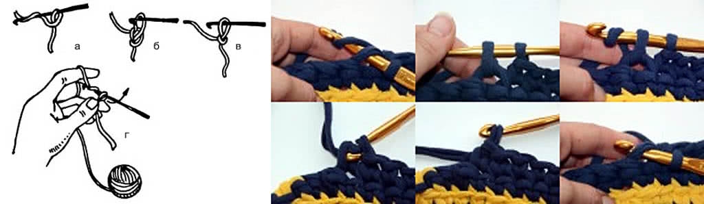 Как делается первая петля при вязании крючком, показано слева на рис. Этого уже достаточно, чтобы, пропуская петельку в петельку, навязать косичек для шитого коврика. А справа там же дано, как подвязывать следующий ряд к предыдущему.