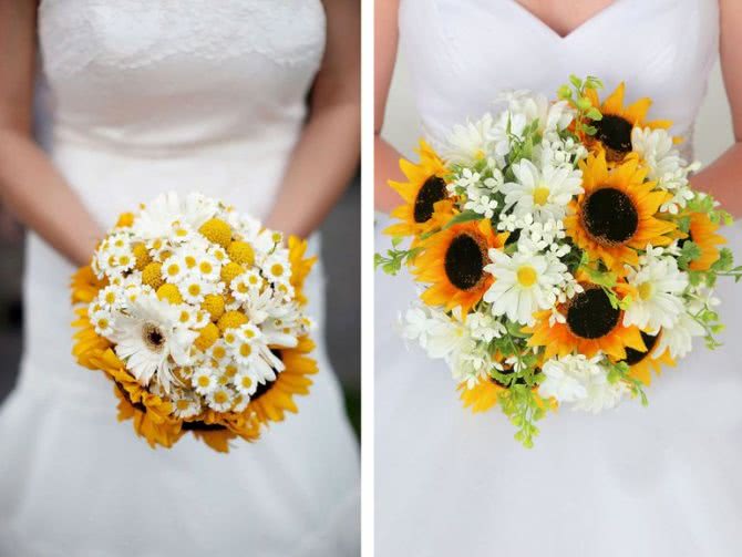По-летнему ярким получается цветочный аксессуар невесты с матрикарией и подсолнухами. В зависимости от того, какие растения добавляются к этому «дуэту», он будет уместен не только в рустикальном, но и в классическом стиле, если свадьба проводится за городом. Чем красочнее аранжировка, тем гармоничнее она впишется в образ задорной, немного дерзкой «деревенской» девушки.
