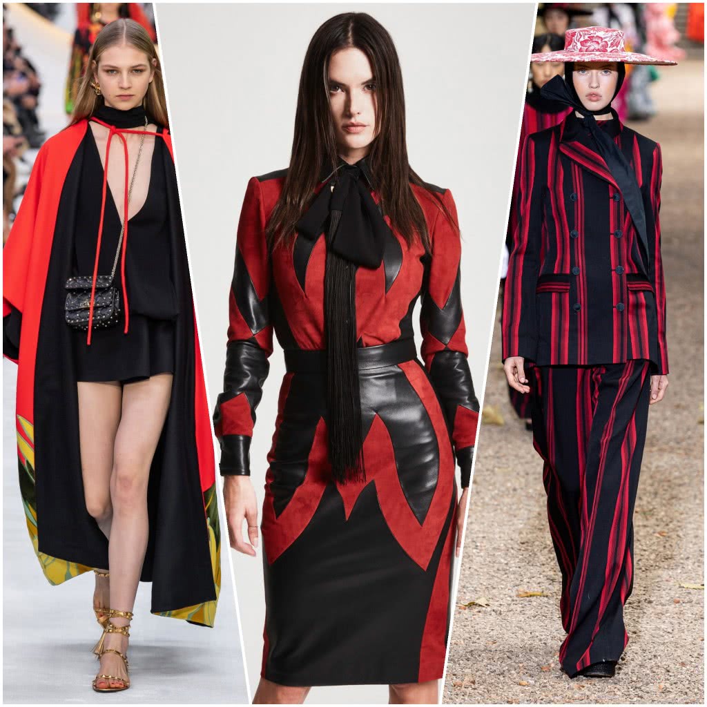 Беспроигнышный вариант для тех, кто опасается слишком активного красного цвета. Черный цвет приглушает красные оттенки, за счет чего образ перестает быть слишком вычурным. И, наоборот, за счет красных вставок черный костюм перестает казаться мрачным: это пример идеального сочетания цветов, когда недостатки одного цвета усиливают преимущества другого. В качестве примера наряд от Valentino и два образа от бренда Dundas.