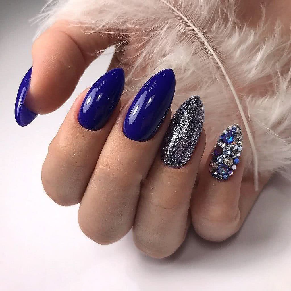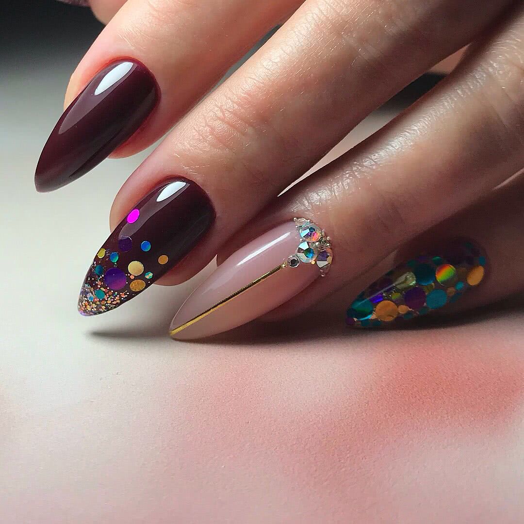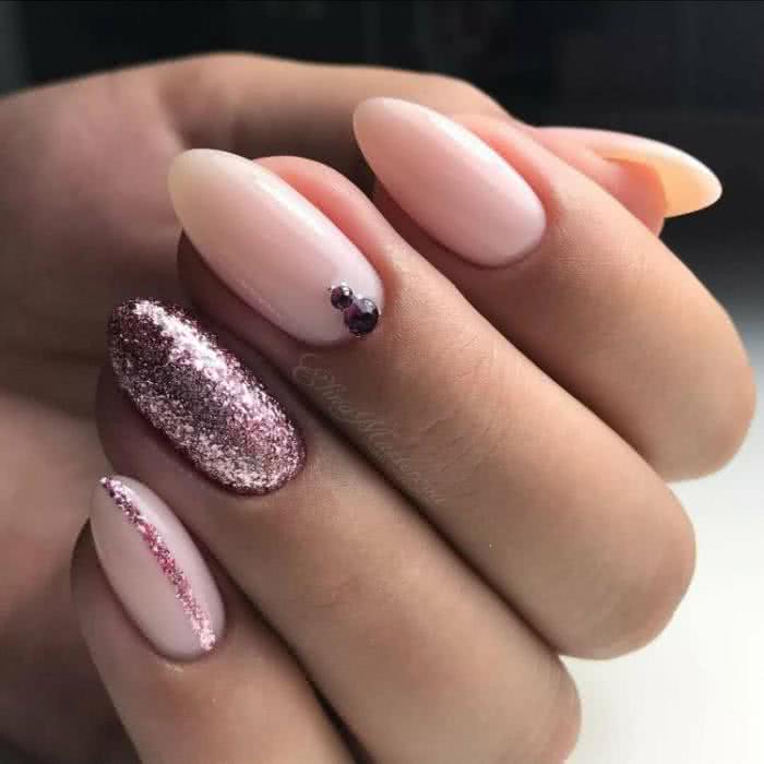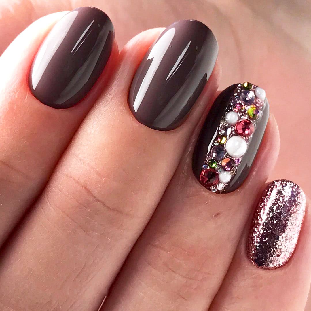 Располагайте стразы в прикорневой зоне на одном из ноготков, выделите место под дизайн блестками, пайетками или глиттером