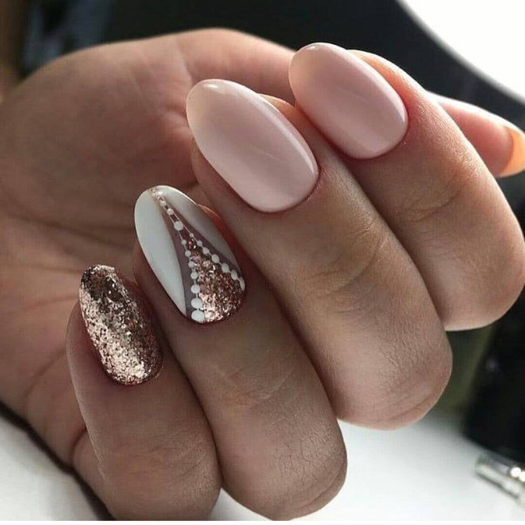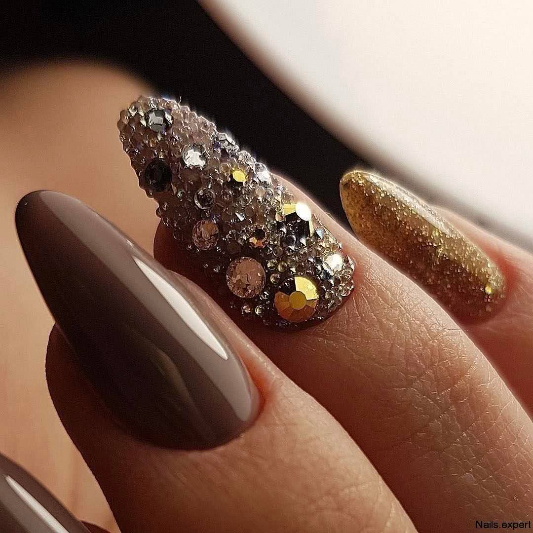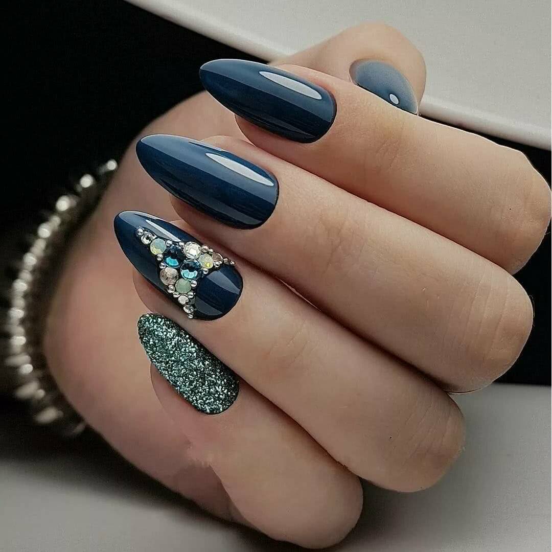 Располагайте стразы в прикорневой зоне на одном из ноготков, выделите место под дизайн блестками, пайетками или глиттером