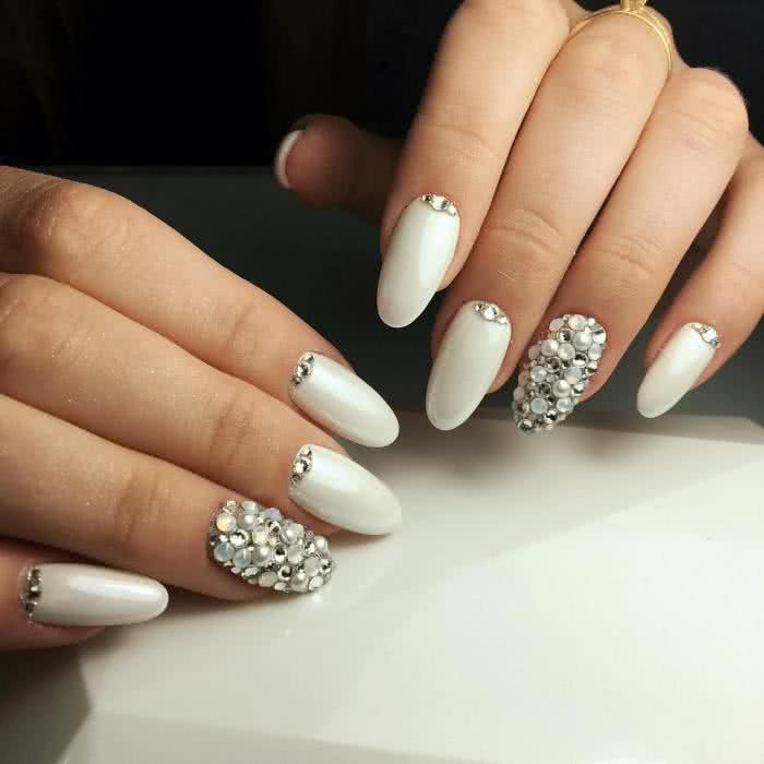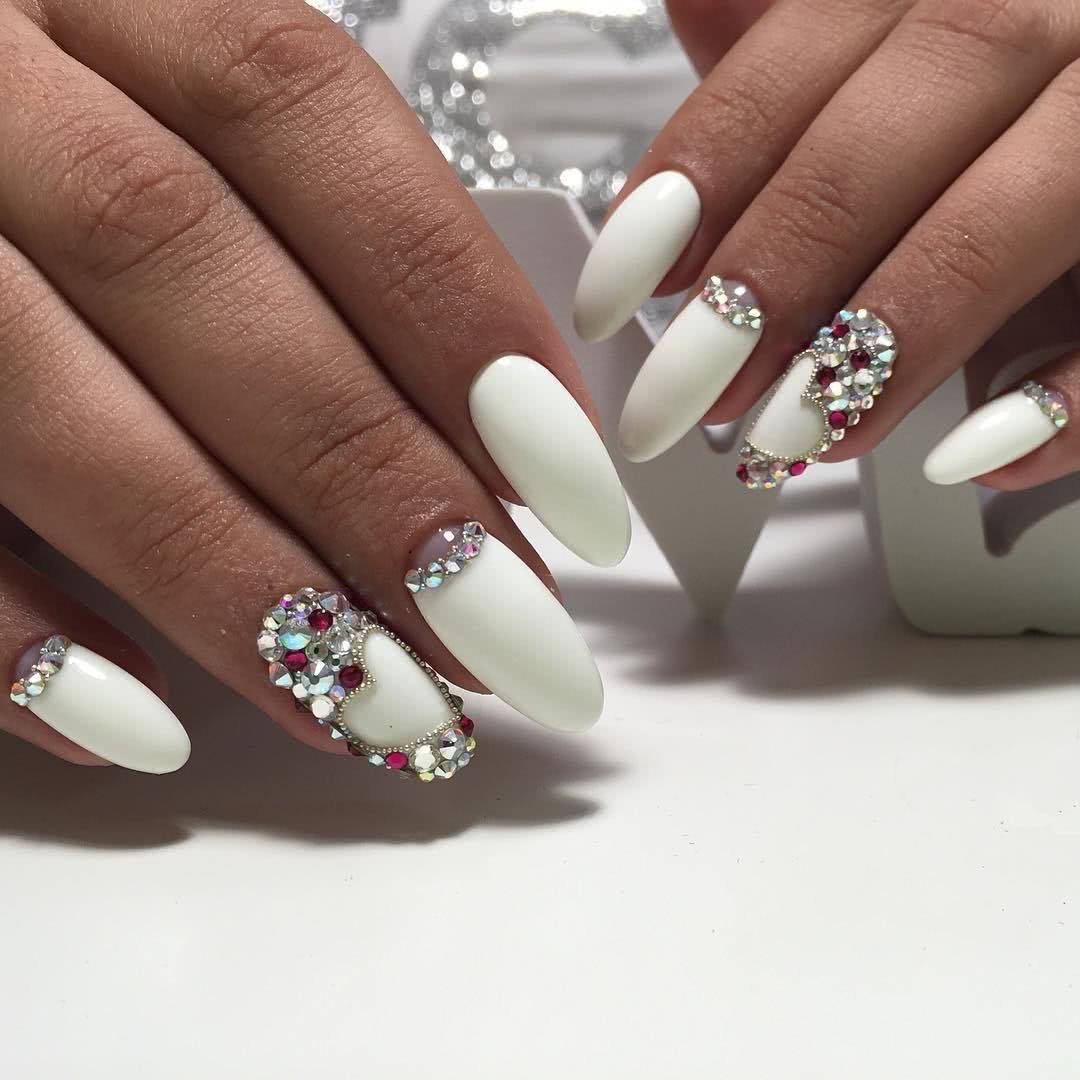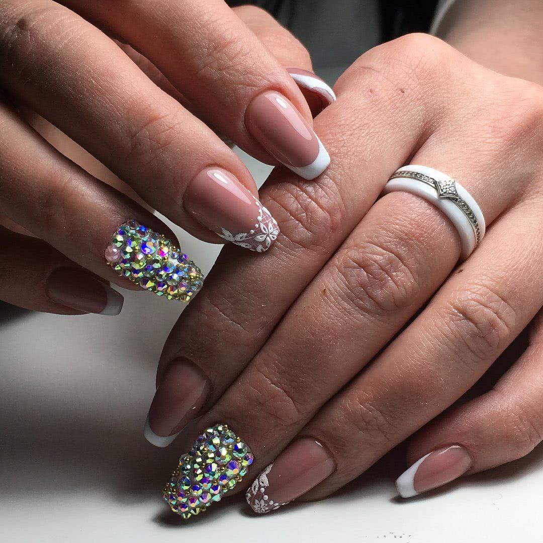 Оформление френча в белом цвете остаётся актуальным во все времена, поскольку белый цвет в нейл-индустрии выполняет роль базового. Благодаря именно этому качеству дамы рискнули немного поэкспериментировать и дополнить маникюр разнообразными видами страз. Для его создания на ногтевую пластину наносится прозрачное, бледно-розовое, персиковое или нюдовое покрытие в качестве основы, а кончик ногтя окрашивается тонкой белой полоской в виде улыбки. Стильно, сдержанно и безумно нежно. Стразы можно расположить непосредственно по линии «смайлика», а можно выложить с их помощью полумесяц или несложный узор в прикорневой зоне. Не менее привлекательно будет смотреться вариант с полным покрытием стразами акцентного ноготка или шармы на белой основе безымянного пальца.