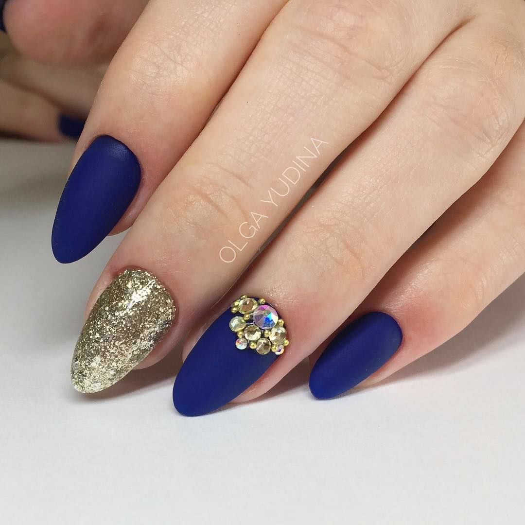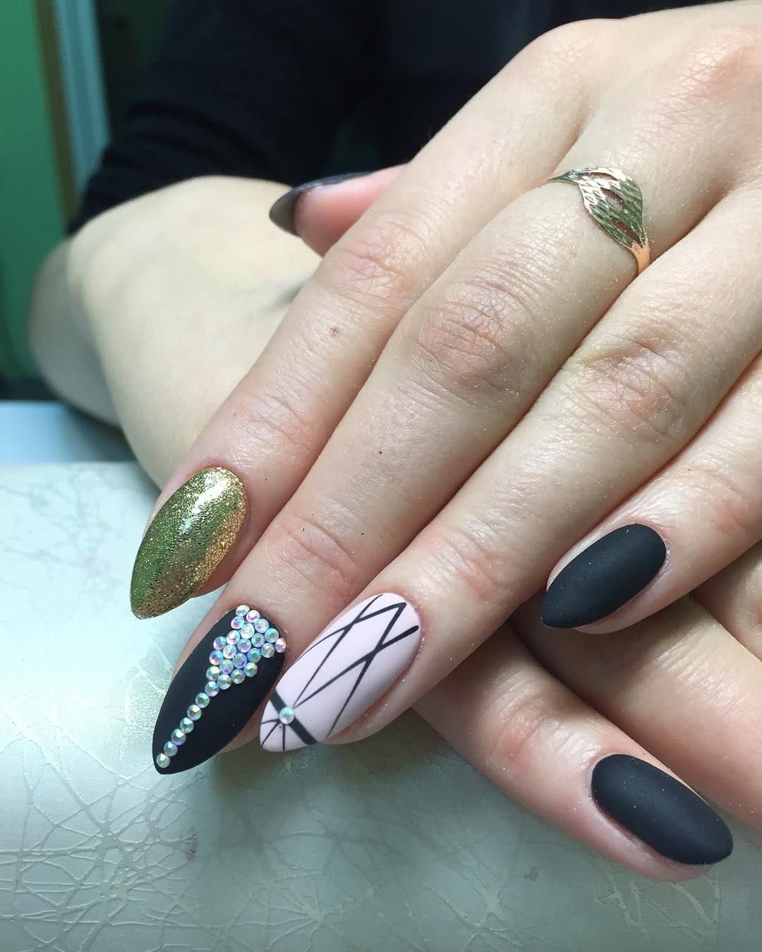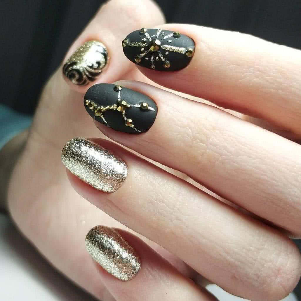 Чёрный бархат на ногтях смотрится особенно шикарно, ведь, как известно матовый топ смягчает любые яркие и тёмные оттенки. Стразы в таком маникюре заметно освежают и облагораживают покрытие. Вы можете расположить блестящие фрагменты в прикорневой зоне одного-двух пальчиков либо украсить бархатистое основание полосками, волнистыми линиями или несложными узорами из стаз. В этом случае следует использовать бульонки, бусины или кристаллы небольшого размера. Наиболее выигрышным тандемом считаются матовый топ и золотистые стразы, но это совсем не означает запрет на использование в маникюре деталей декора другого окраса. Помимо этого, матовые ноготки очень красиво преподносят соседство стразов с блёстками глиттера и пайетками. В зависимости от количества и вариаций расположения декора, такой нейл-арт станет прекрасным дополнением как торжественного, так и повседневного лука.