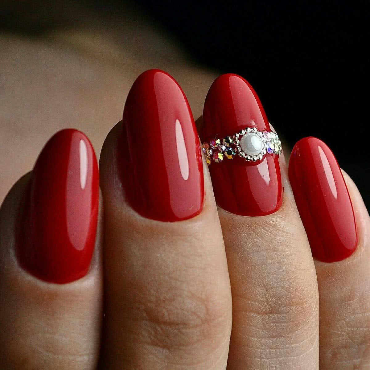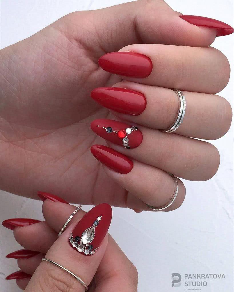 Поистине потрясающе смотрится маникюр в красном цвете со стразами, если он нанесен на длинные ногти: