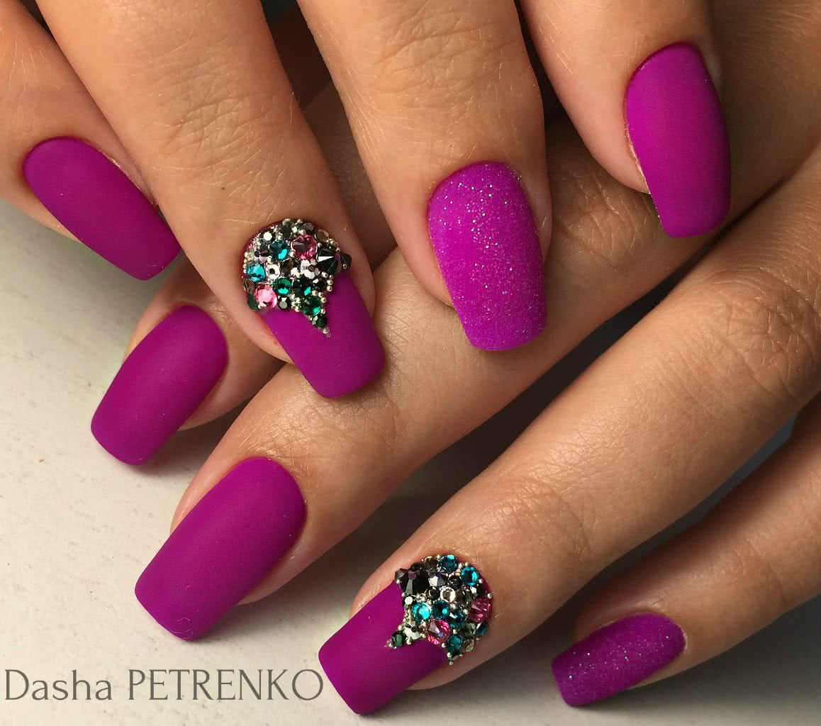 В последние годы он стал особенно актуальным. Полное отсутствие блеска с успехом компенсируется стразами. Их свечение на матовой поверхности смотрится очень изысканно и сдержанно. При этом можно как прикрепить их в одиночном порядке, так и создать некий рисунок.