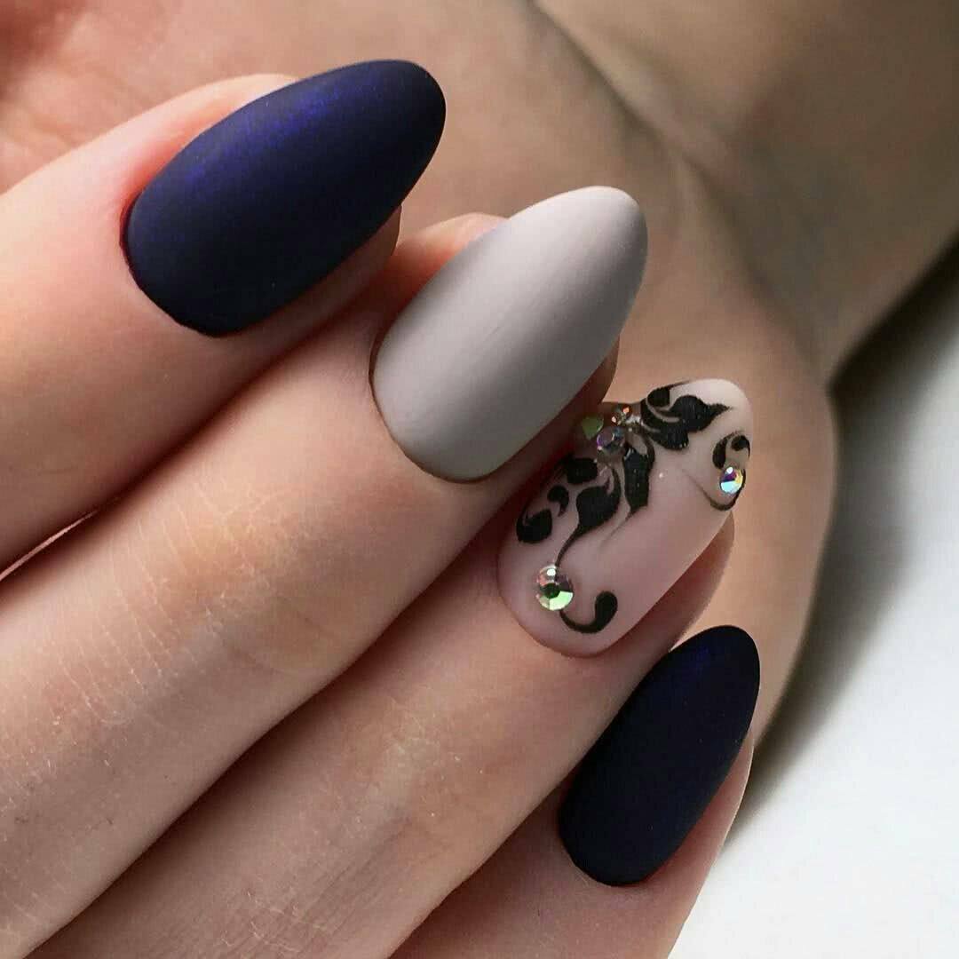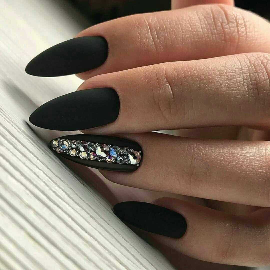 Красиво и элегантно выглядит матовый черный френч со стразами. Дизайн смотрится привлекательно на квадратных, овальных и миндалевидных ногтях. Эти лаконичные формы помогают создать нежные и аккуратные нейл-арты, которые не нуждаются в дополнительном декоре, помимо страз.
