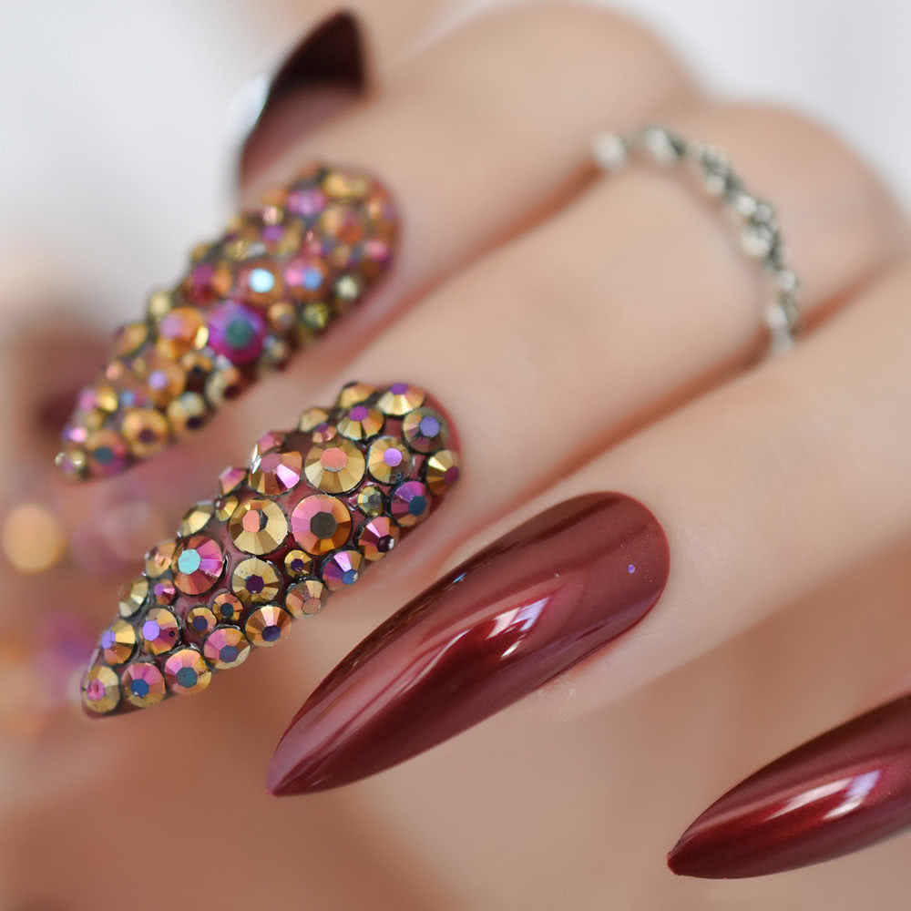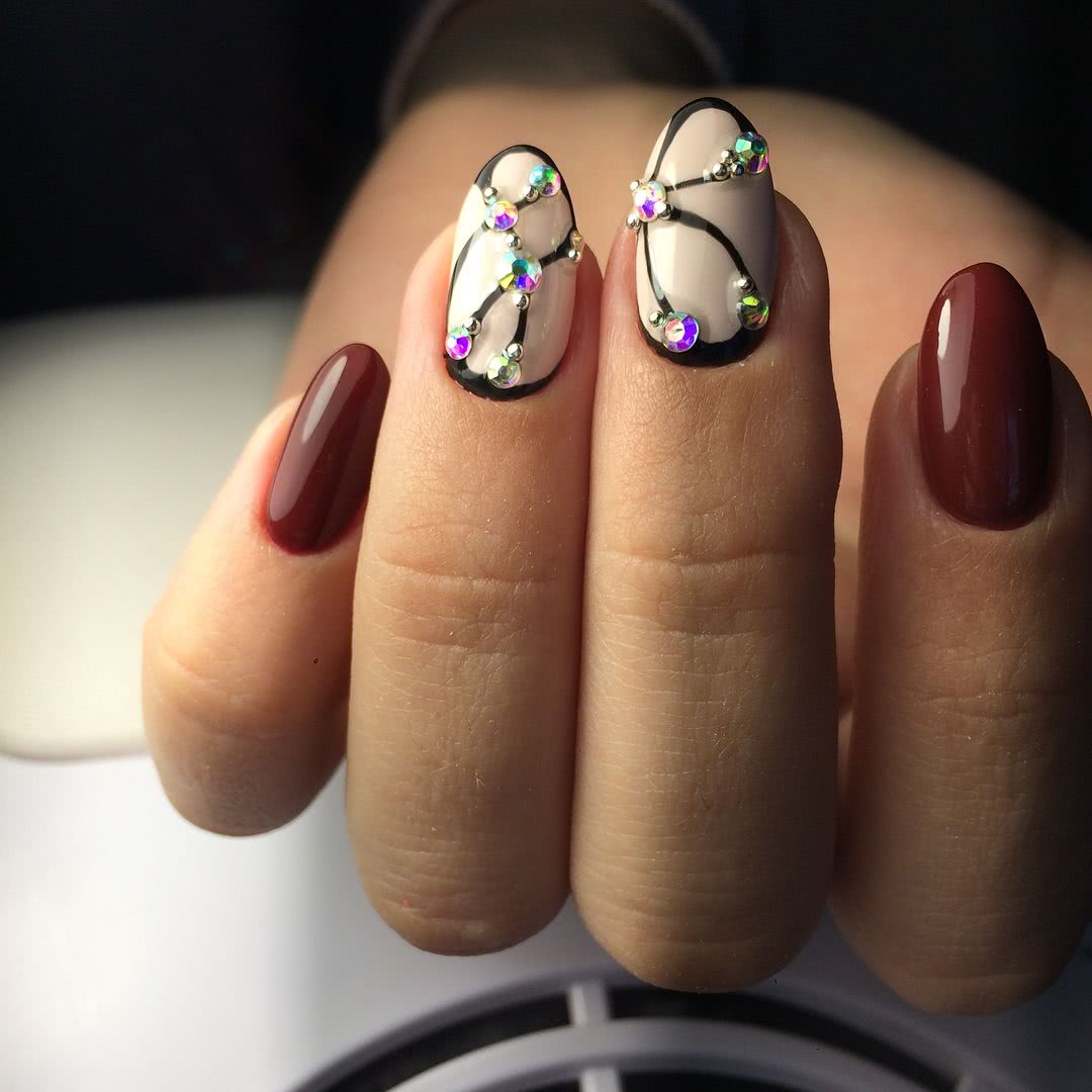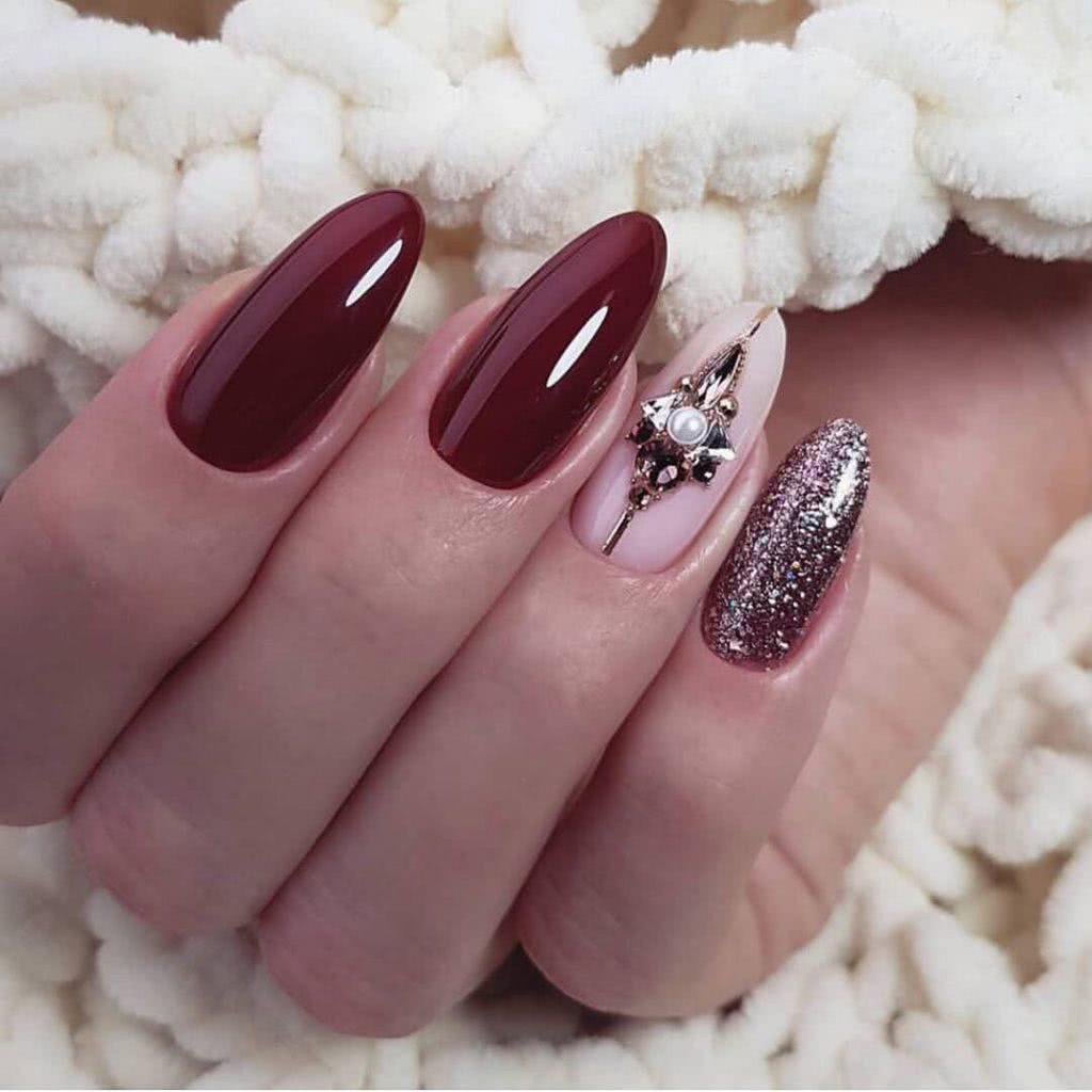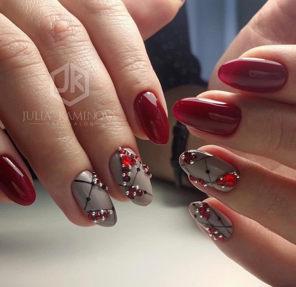 Сегодня красный острый маникюр смотрится гораздо сдержаннее. Девушки предпочитают украшать острые ногти темными оттенками красного, например, бордовым, винным, гранатовым, сливовым. Что касается стразов, то их количество значительно уменьшилось. Стразы, бульонки, камни располагают в прикорневой зоне 1-2 ноготков, используются для создания полосок или простой геометрии.