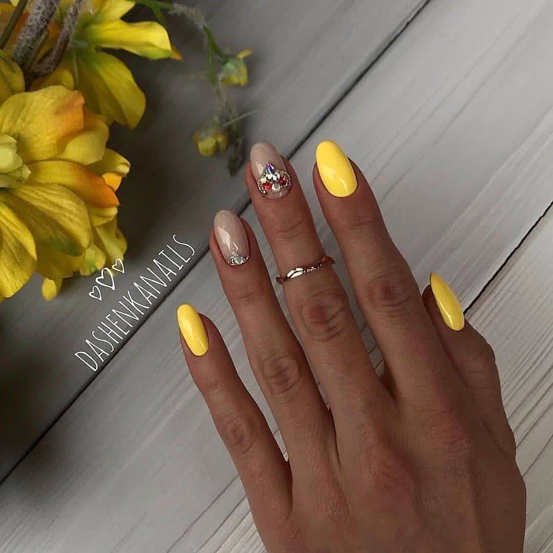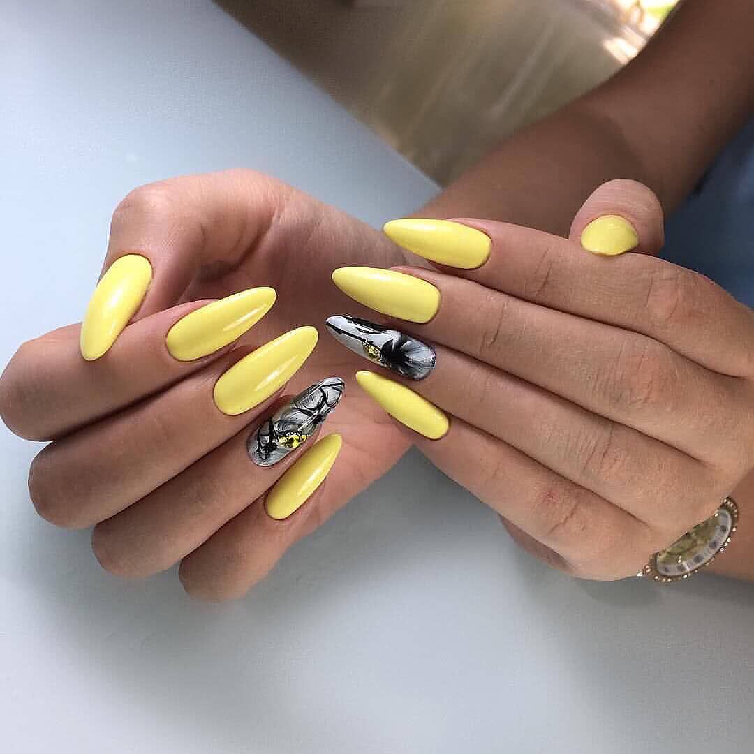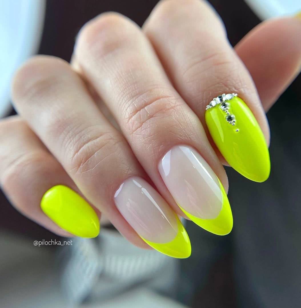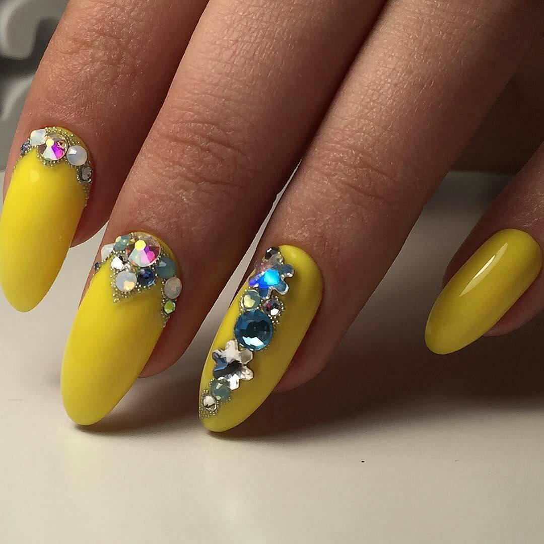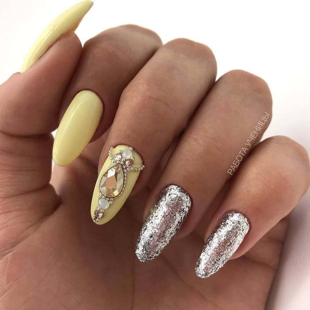 В тренде лимонный, лаймовый, горчичный, алый и другие оттенки, которые заряжают позитивом, вдохновляют девушек, шикарно смотрятся в летних образах. Чтобы смягчить яркость оттенков, нейл-мастера используют матовое покрытие. Яркие оттенки шикарно смотрятся с однотонным покрытием 1-2 ноготков серебряным глиттером, пайетками, кристаллами Пикси, стразами необычной формы. На ярком фоне можно поэкспериментировать и создать эффектный и заметный дизайн, который не всегда получается на светлых пастельных оттенках.