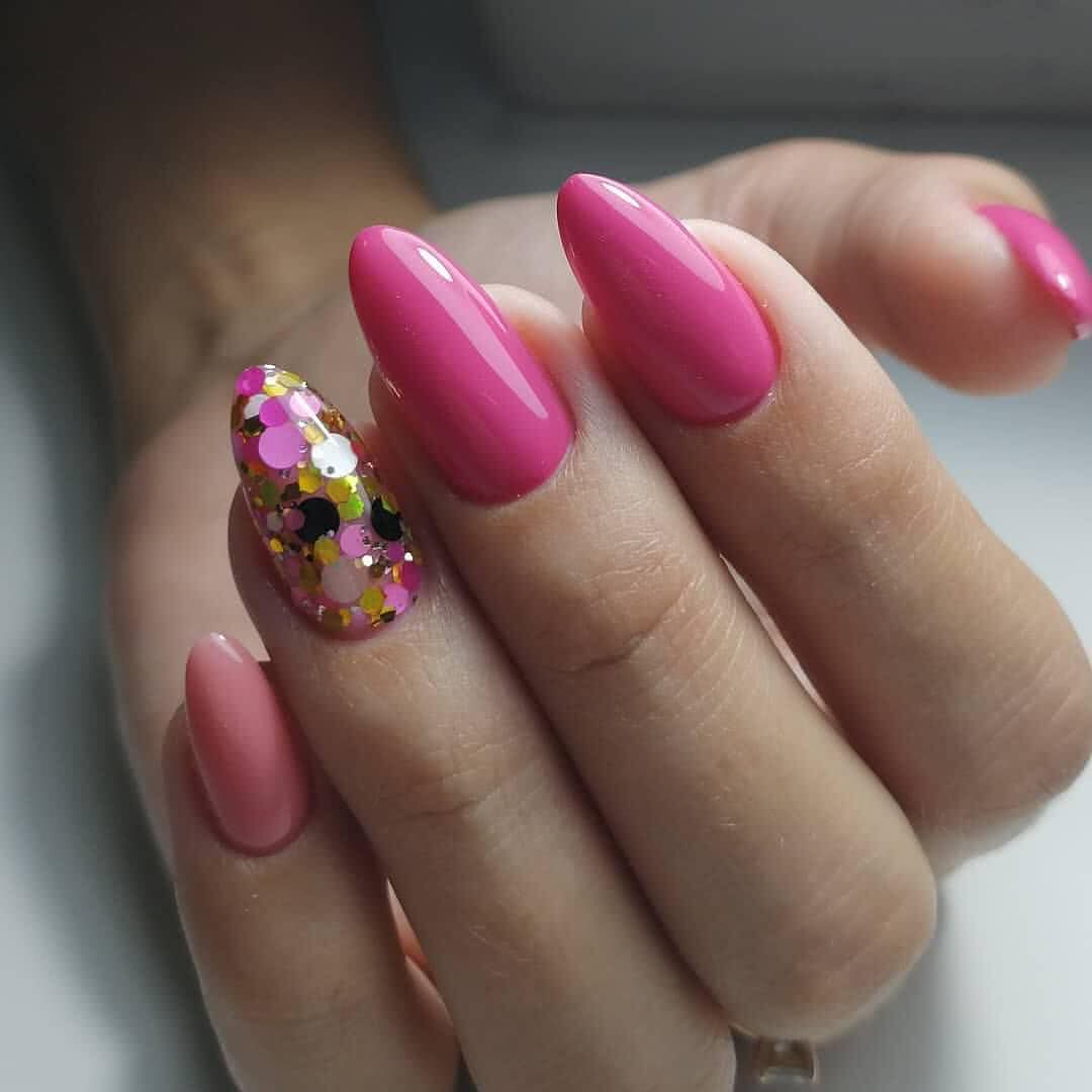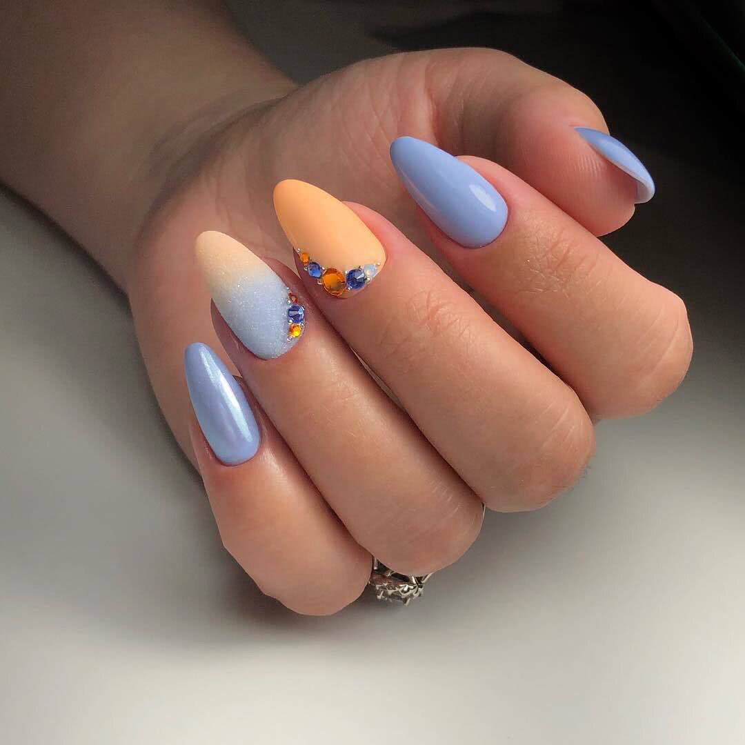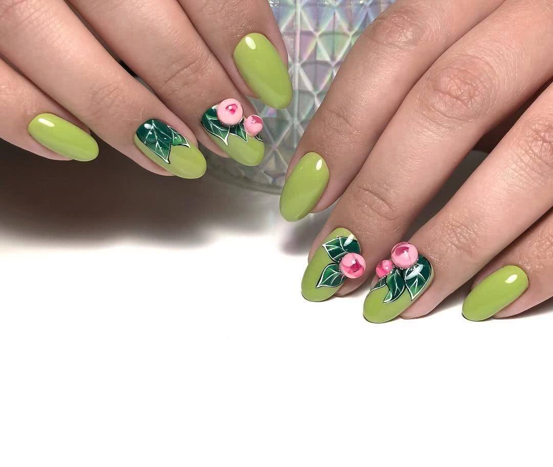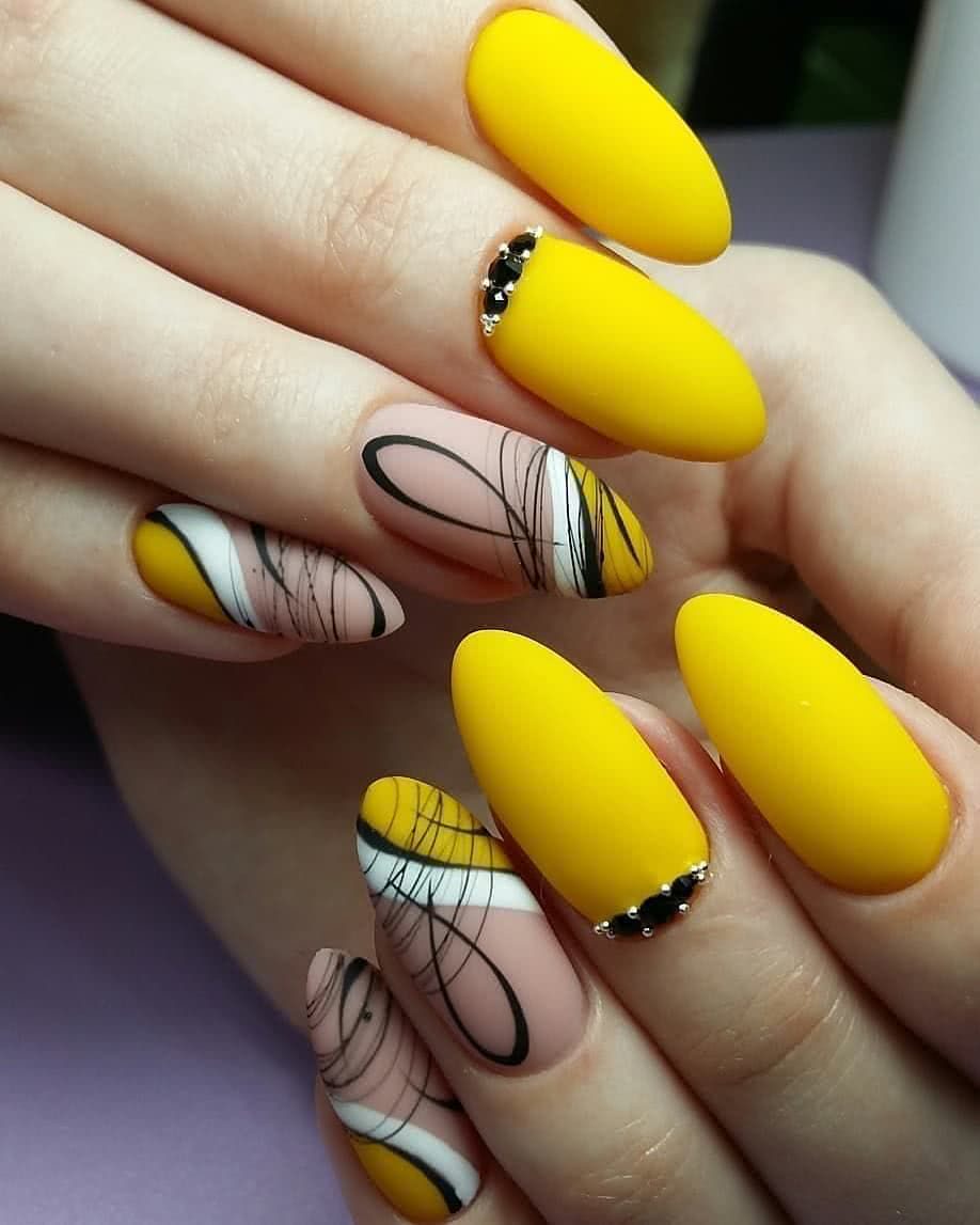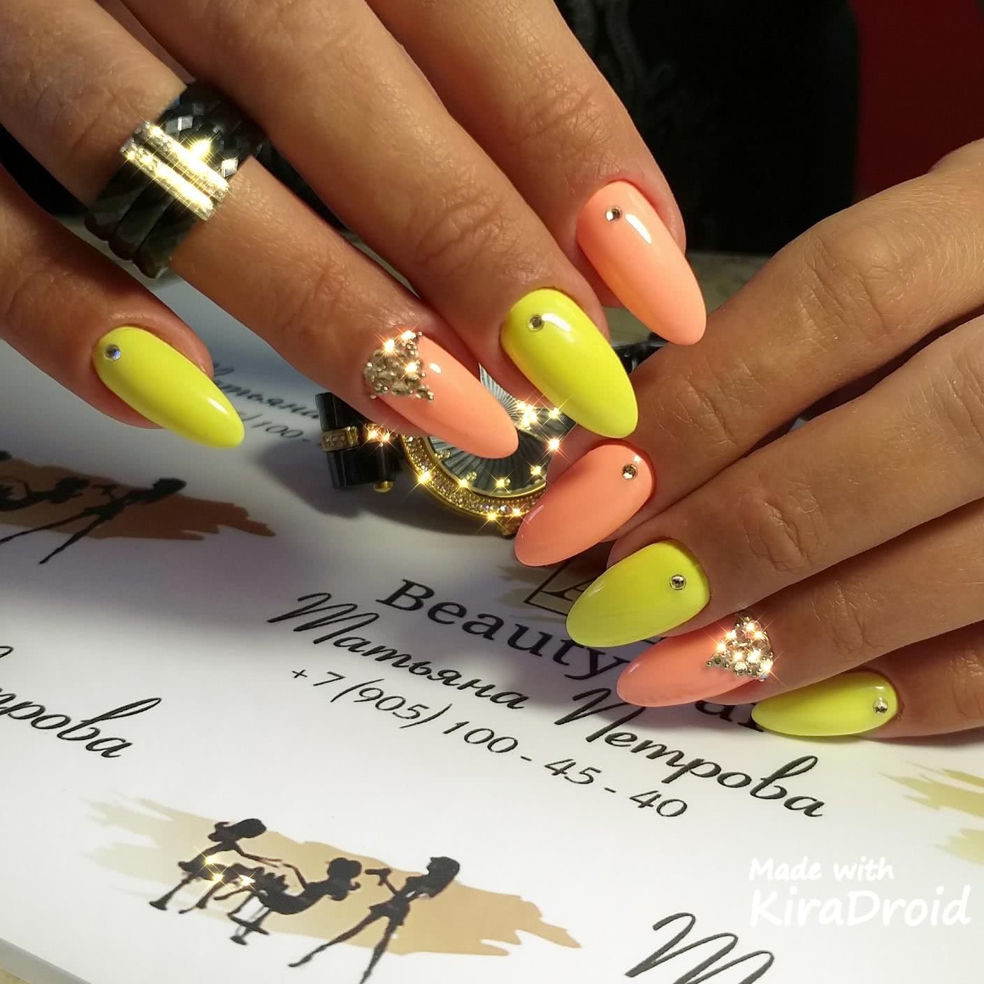 В тренде лимонный, лаймовый, горчичный, алый и другие оттенки, которые заряжают позитивом, вдохновляют девушек, шикарно смотрятся в летних образах. Чтобы смягчить яркость оттенков, нейл-мастера используют матовое покрытие. Яркие оттенки шикарно смотрятся с однотонным покрытием 1-2 ноготков серебряным глиттером, пайетками, кристаллами Пикси, стразами необычной формы. На ярком фоне можно поэкспериментировать и создать эффектный и заметный дизайн, который не всегда получается на светлых пастельных оттенках.