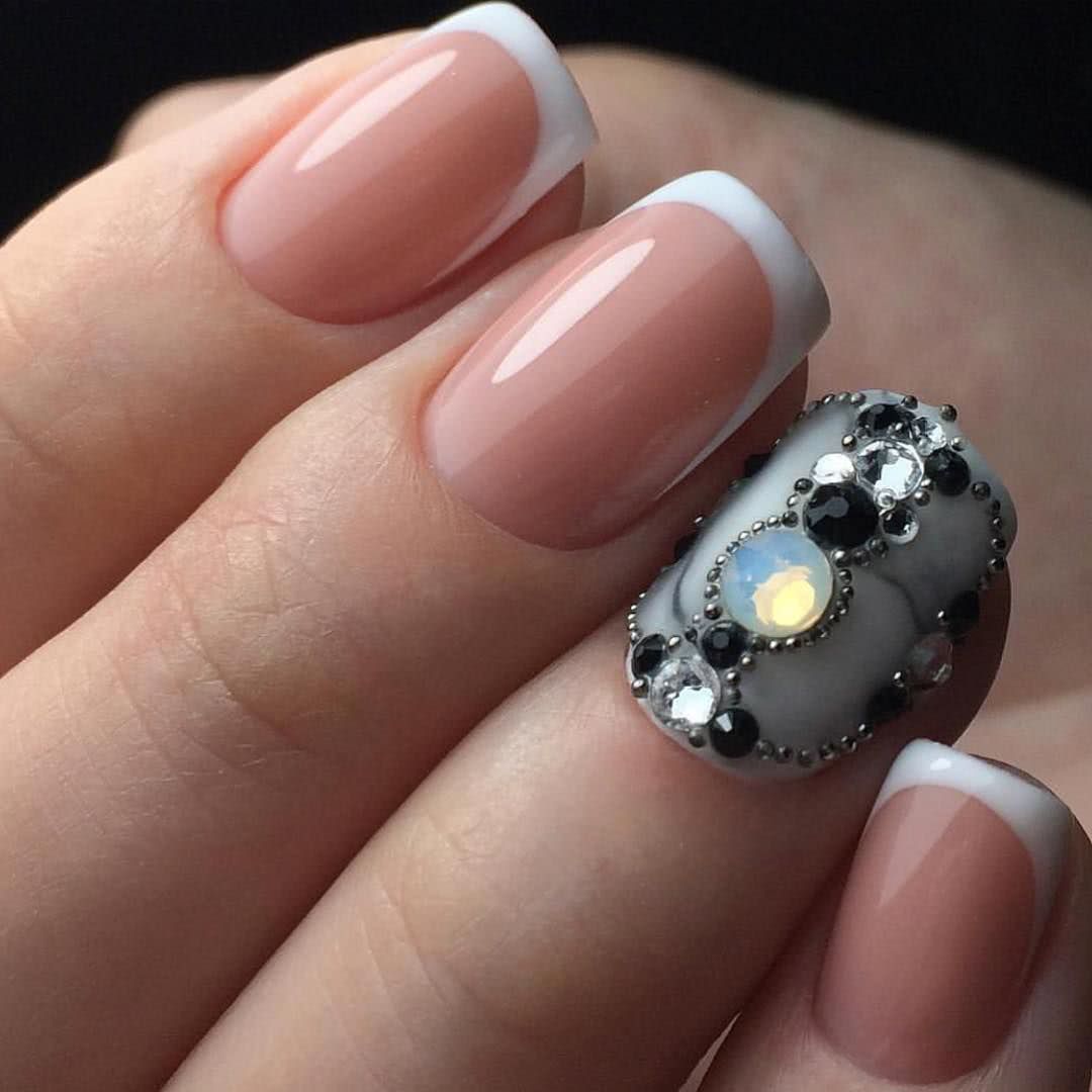 Френч – тот дизайн ногтей, который стерпит соседство с самым разнообразным декором. Именно стразы первые стали появляться во французском дизайне ногтей и удачно вписались в эту классическую технику маникюра.