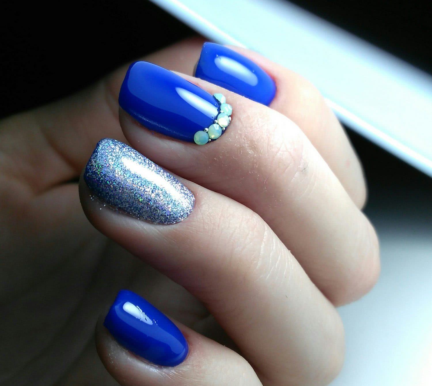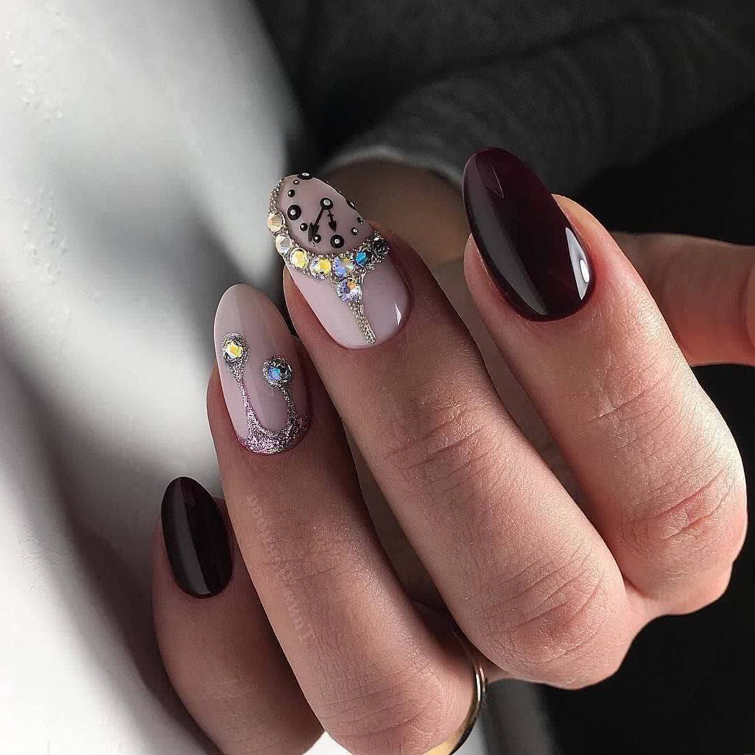 Если вы только начали осваивать дизайн со стразами и боитесь испортить маникюр, то ограничьтесь несколькими камнями в прикорневой зоне 1-2 ноготков. Выбирайте стразы на серебряной подложке и оформляйте ими однотонные нейл-арты. Профессиональные нейл-мастера создают целые композиции из стразов разного размера, формы и расцветки. Для такого маникюра используются крупные стразы, бульонки, пайетки. Стильно смотрится инкрустация стразами одного из ноготков. Такой дизайн сложно назвать повседневным, но в торжественных образах он выглядит невероятно стильно и эффектно.