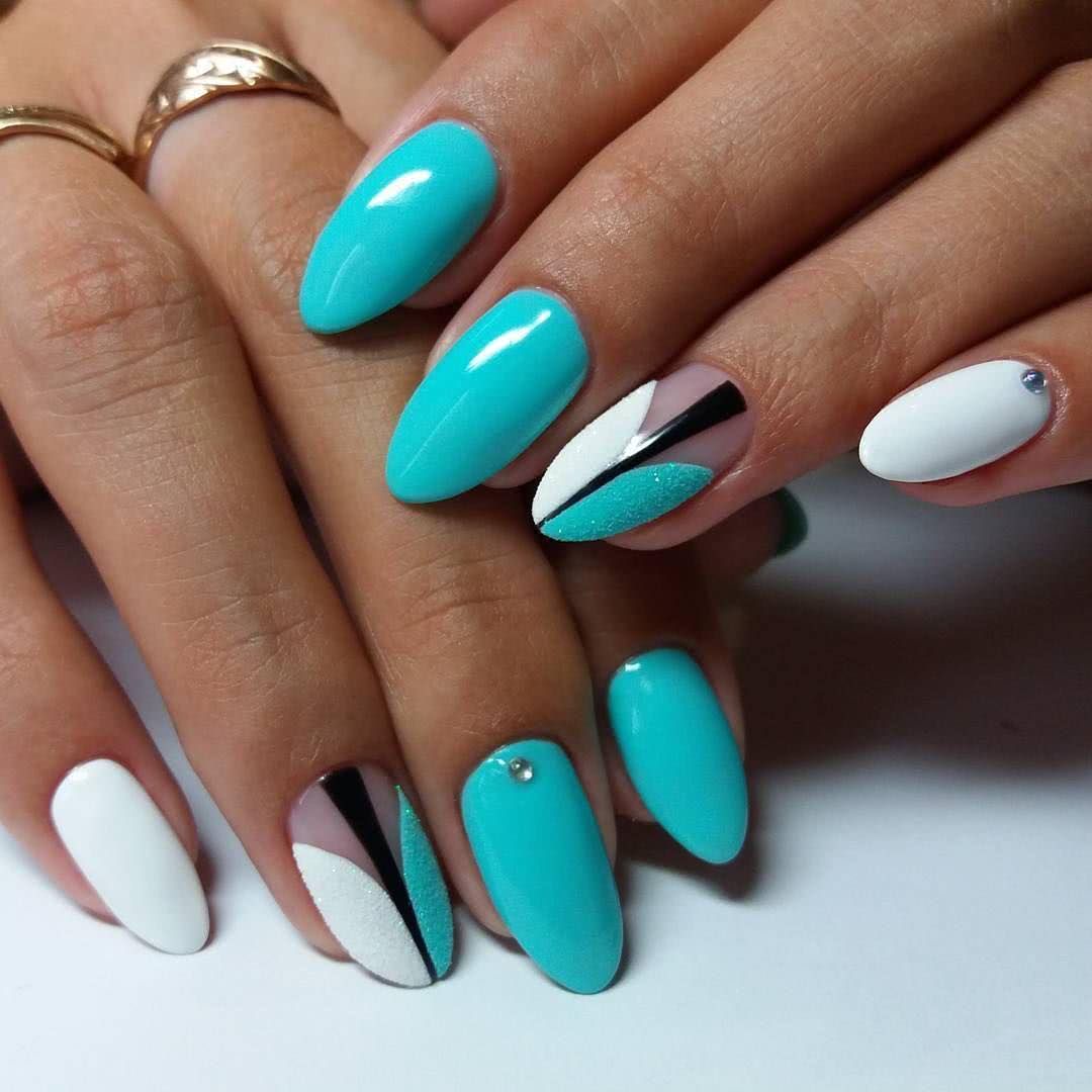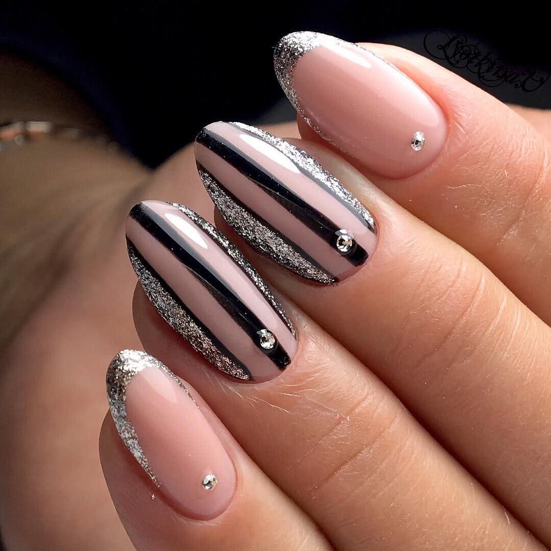 Многие барышни считают геометрические рисунки на ногтях слишком строгими, поэтому использование в маникюре блёсток поможет сгладить «острые углы» и сделает маникюр более женственным. В этом примере рекомендовано использовать мелкие частицы, например, глиттер или шиммер. Для создания эффектного геометрического дизайна, блёстками следует оформлять некоторые геометрические фигуры на ногтях, которые, в последствие, будут прорисованы чёрным лаком. Также, как вариант, можно прорисовать блеском детали по контуру и дополнительно выделить декором полностью один ноготок. Любой из примеров смотрится очень симпатично.