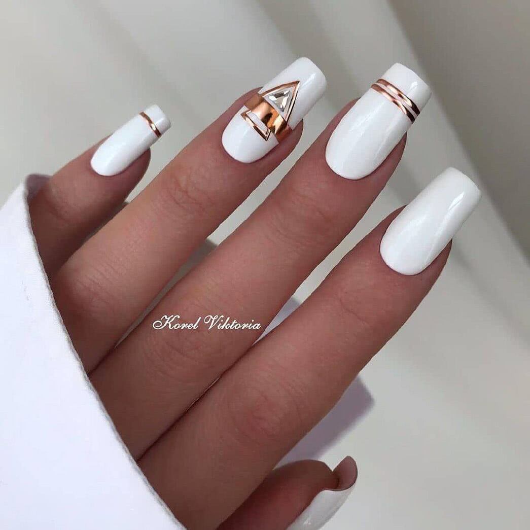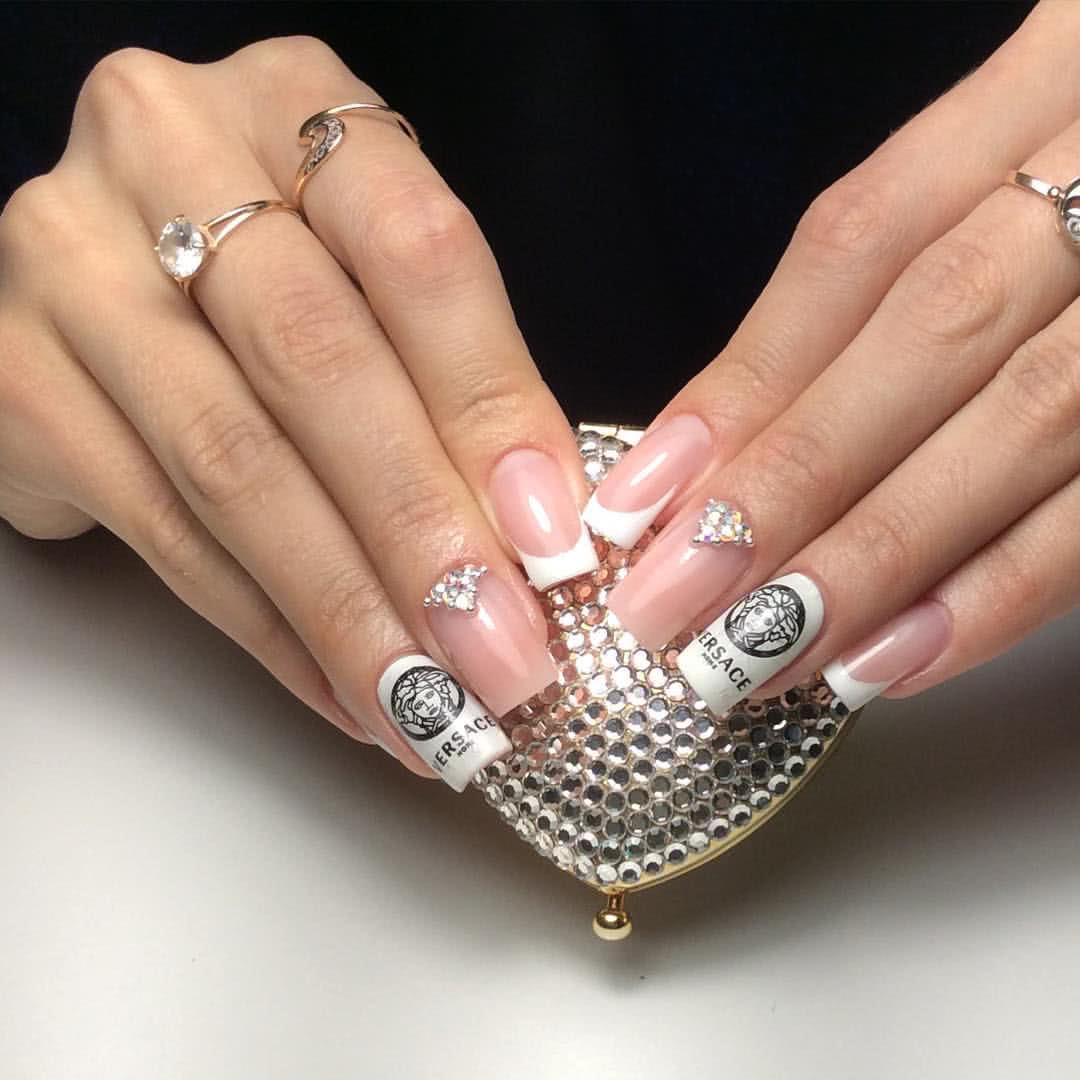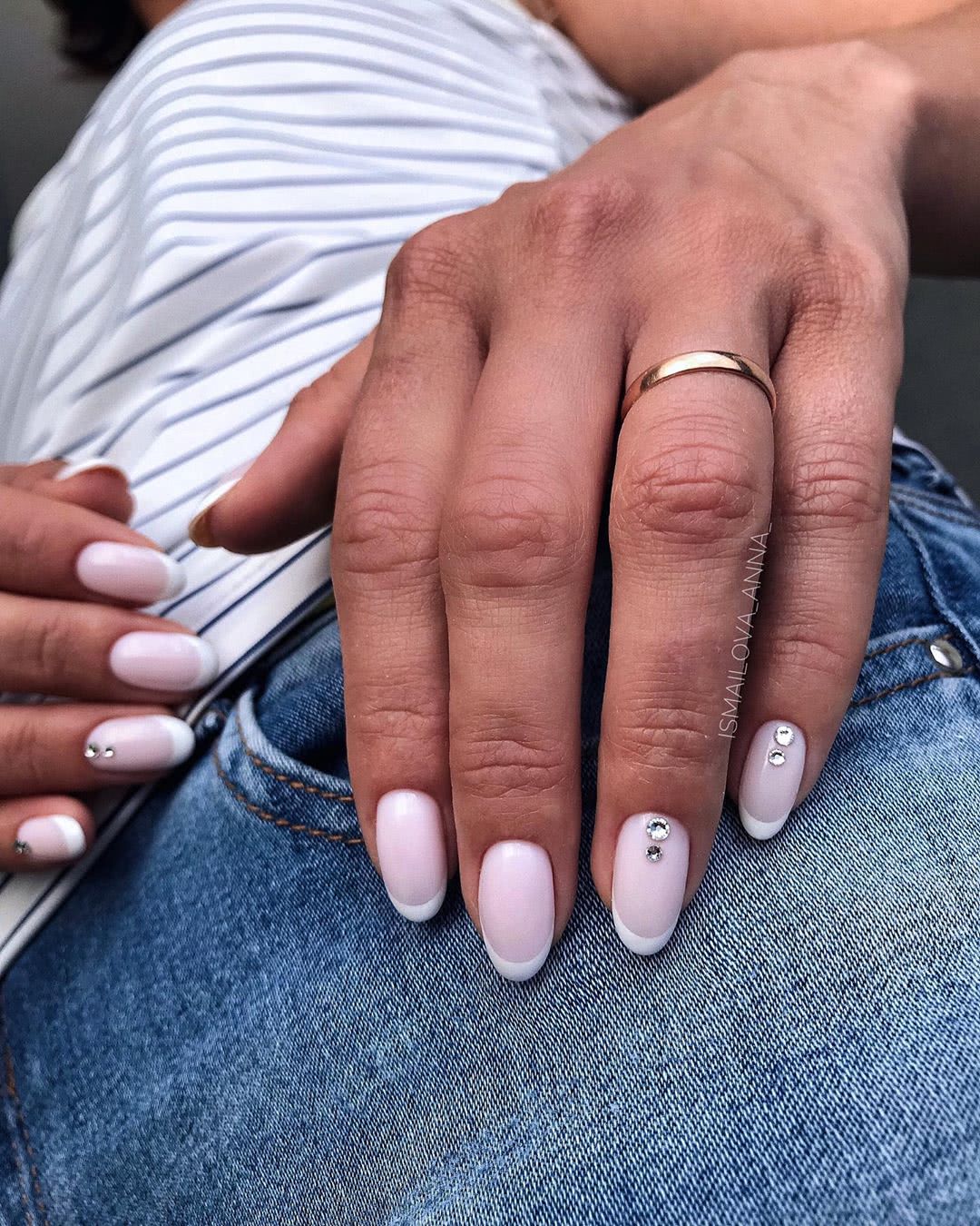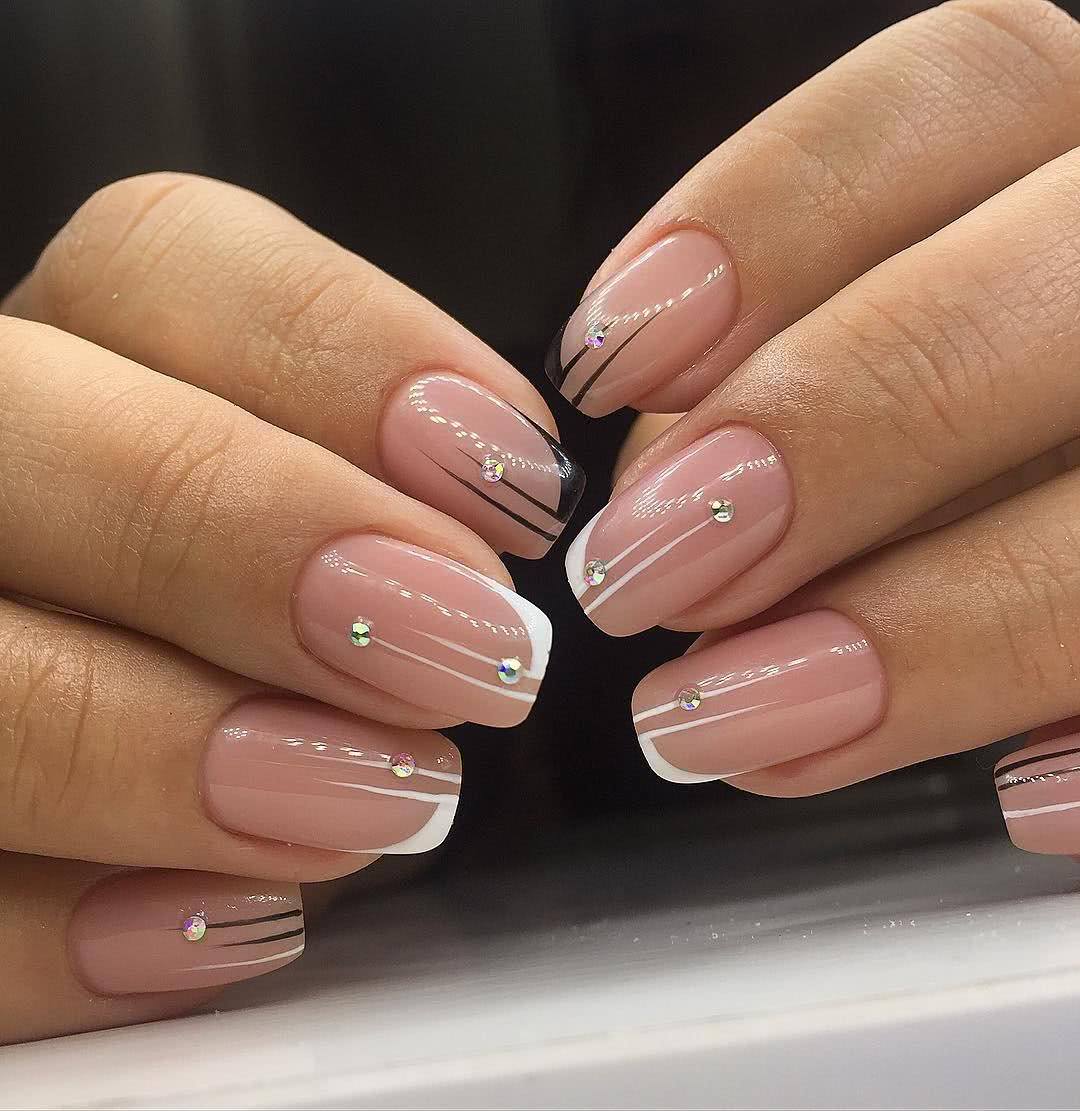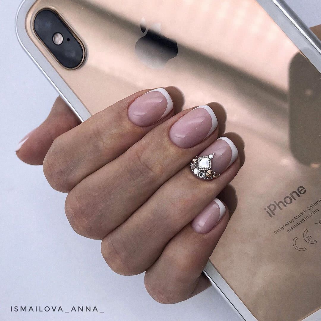 Классический вариант. Он подойдет активным женщинам, которые сочетают в себе несколько ролей. Нежно и аккуратно смотрится и с офисным «луком», и со свободным стилем «кэжуал» на прогулках. Стразы придадут блеска и избавят от эффекта обыденности. Расположить их можно как в уголках или по линии роста у основания, так и на свободном крае.