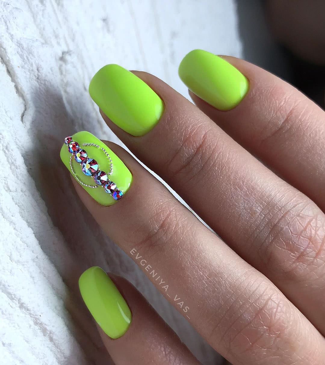 Яркий монохромный маникюр со стразами