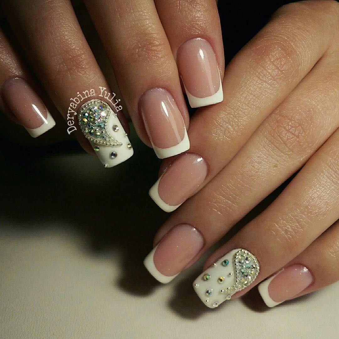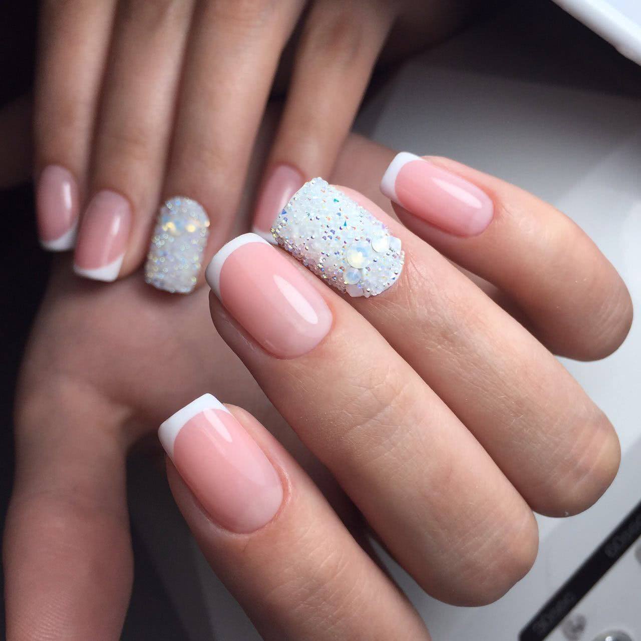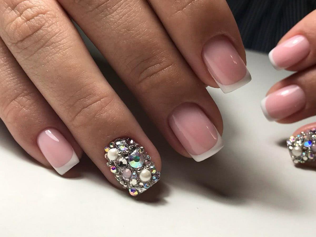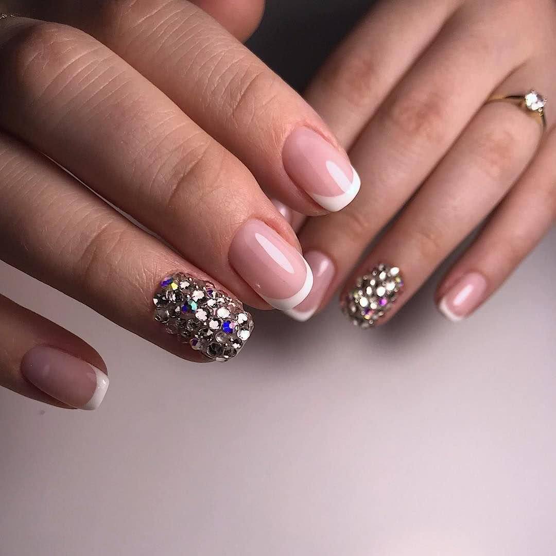 #1 Французский маникюр с блестками и стразами