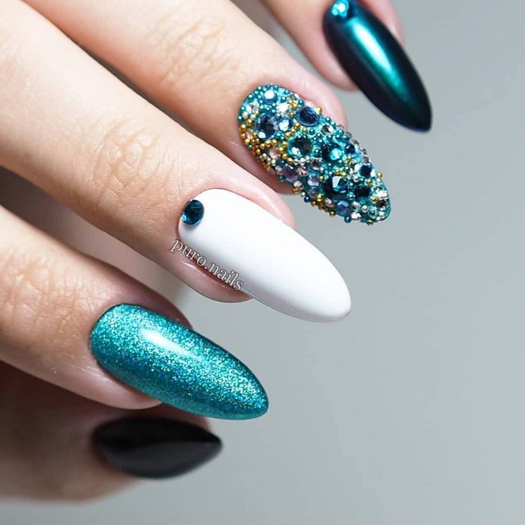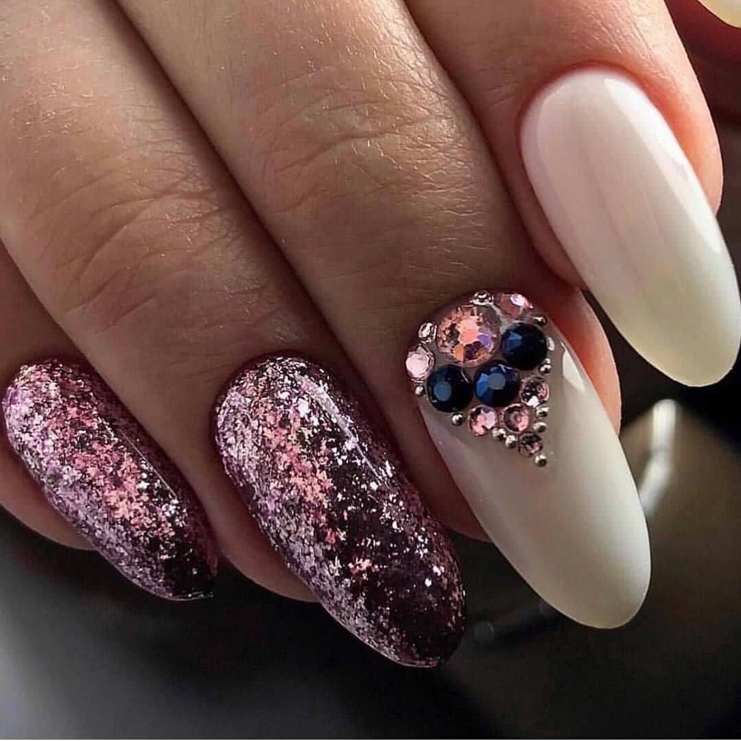 Стразы и блестки – соседство, которое всегда выручало девушек, желающих создать шикарный дизайн ногтей. Разнообразие материала настолько огромно, что каждая модница найдет блестки под себя. Не бойтесь добавлять в свои нейл-арты блестки, стразы и камни. При грамотном исполнении такой маникюр будет выглядеть удивительно красиво и стильно.