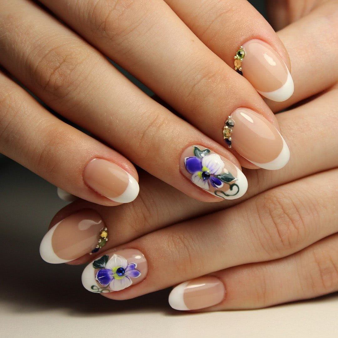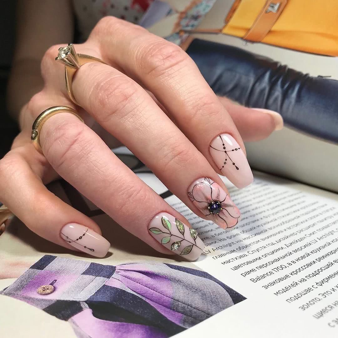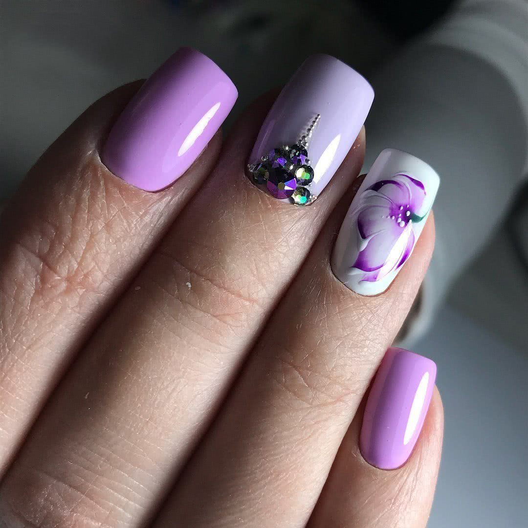Когда речь идет об оформлении ноготков, многие представляют нежный оттенок лака с цветочным рисунком. Это не удивительно, ведь именно такой дизайн олицетворяет естественную женскую красоту и легкость. Поэтому цветы достаточно часто изображают на ноготках, чтобы сделать образ более женственным и романтичным. Ну а небольшое количестве страз добавят необходимой яркости, которая также нужна в современном маникюре.
