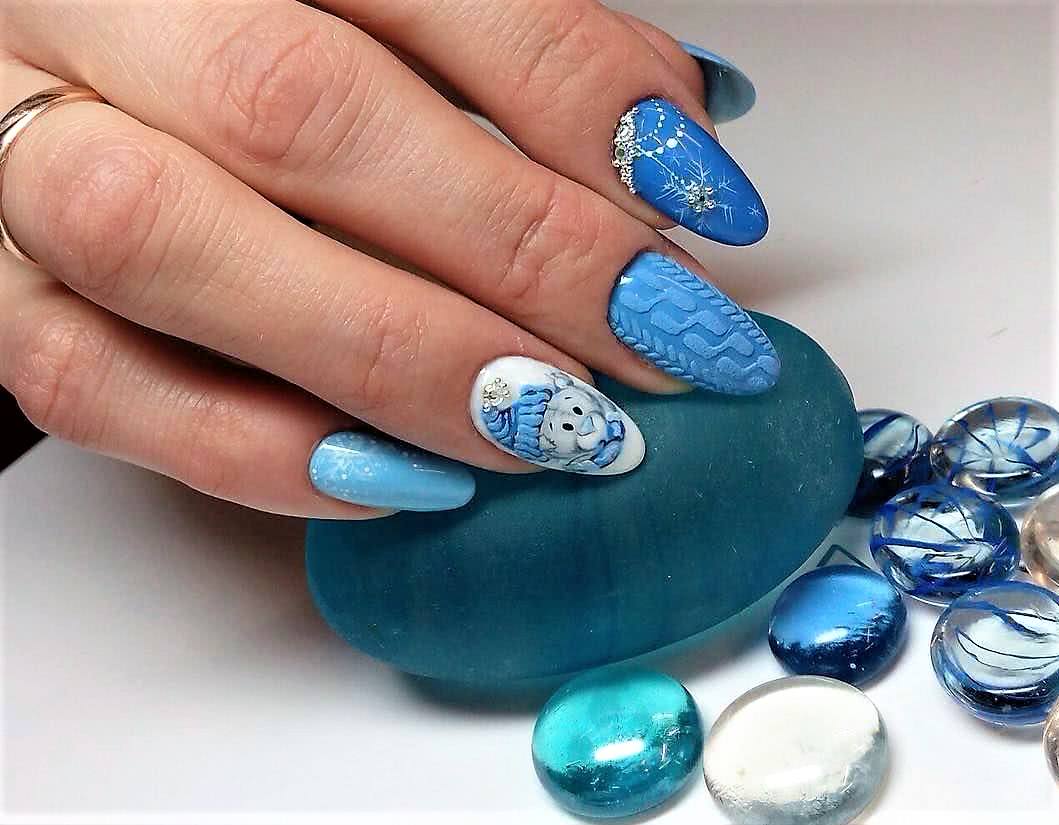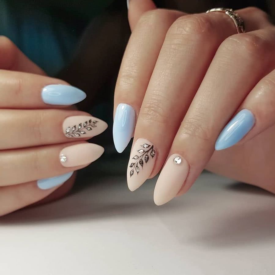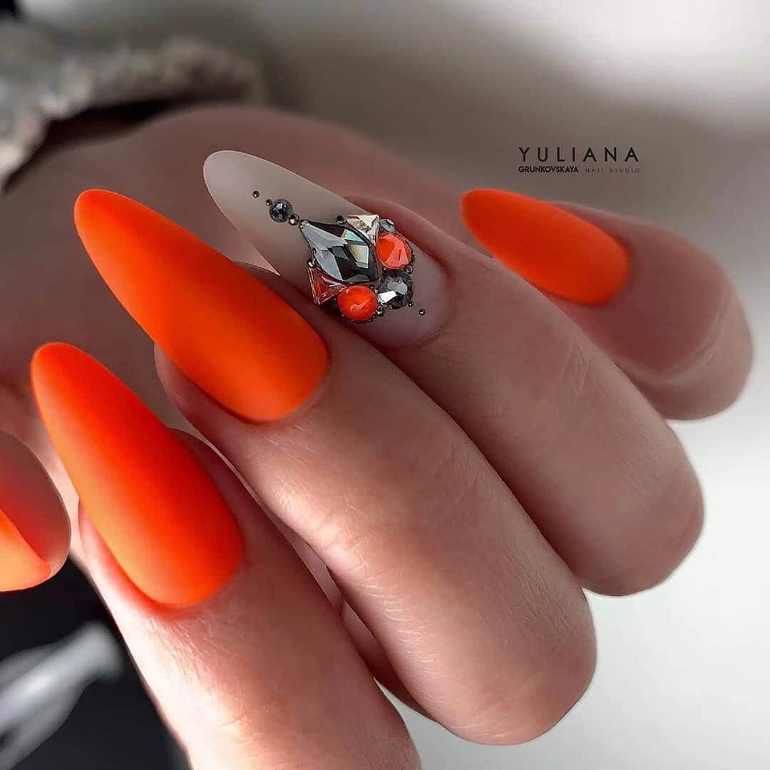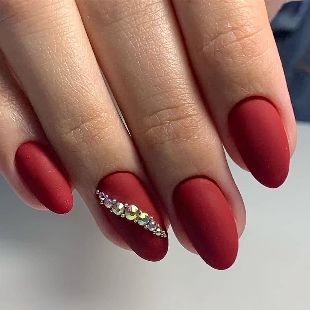 Обладательницы длинных ногтей хорошо знают как облагородить и смягчить свои нейл-арты. Для этого они используют матовую текстуру, меланж, “сахарок” и другой материал, придающий ноготкам бархатистую нежность. Матовый маникюр на острых ногтях может быть выполнен в темных насыщенных оттенках. Чаще всего для дизайна используют бордовый и черный цвета. Стразы располагают классическим способом: в прикорневой зоне, посередине ногтя полоской, поперек ногтя, в виде волны.