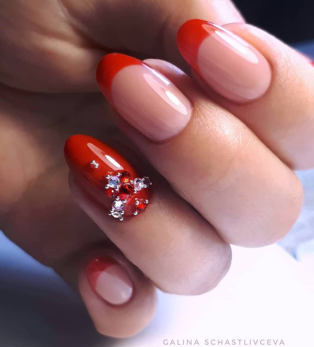 Красный французский маникюр со стразами