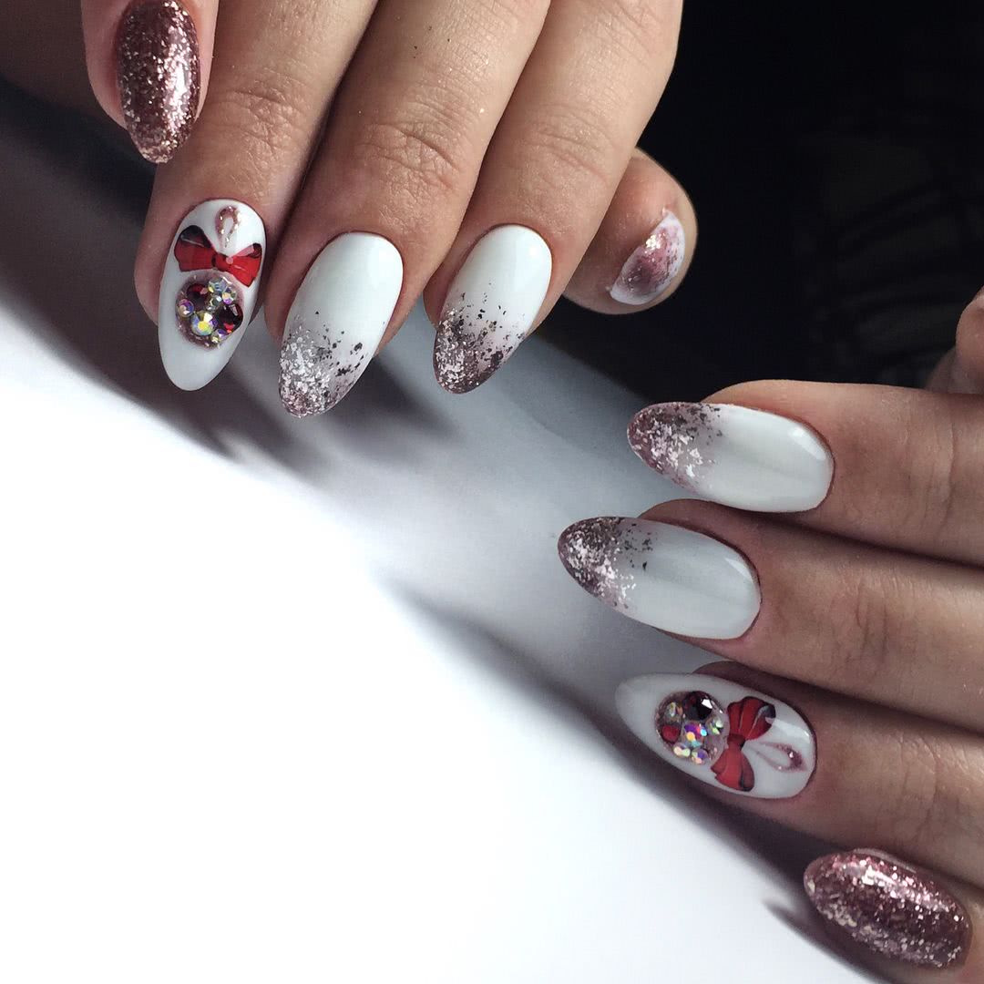 Важно отметить, что каждая частичка новогоднего маникюра украшена камнями: центр снежинок, завязка бантика и даже снежное посеребренее на указательном пальце. Имея такой маникюр, можно смело ждать прихода Деда Мороза