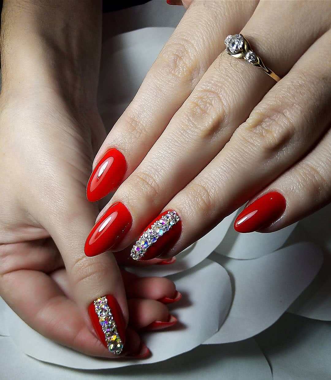 Можно создать поистине шикарный красный маникюр со стразами, если нанести его на ноготки заостренной формы. Такая вариация нейл-арта будет обоснованно ассоциироваться с повышенной сексуальностью и соблазнительностью, поскольку для этого используются сразу две составляющие: яркий насыщенный тон и острая форма ногтей: