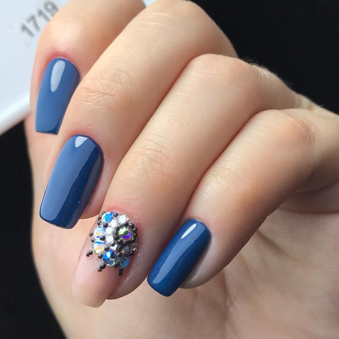 - Камушками можно выделить какой-либо один палец и сделать его основным акцентом стильного нейл-арта. Традиционно такой прием применяется на безымянном пальце.