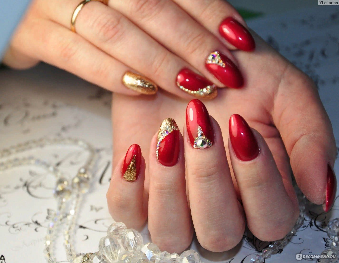 Красный маникюр со стразами на острые ногти