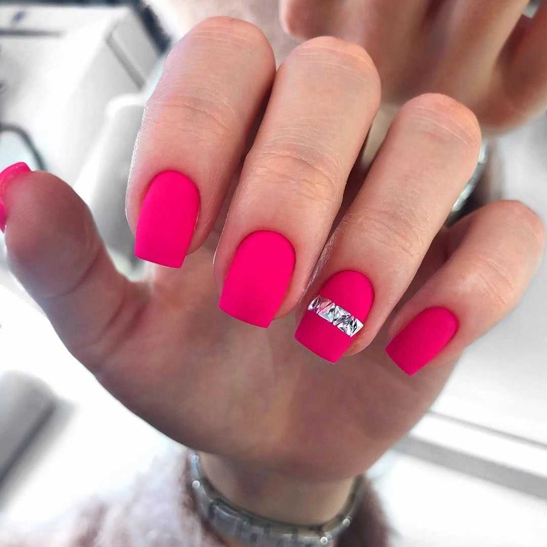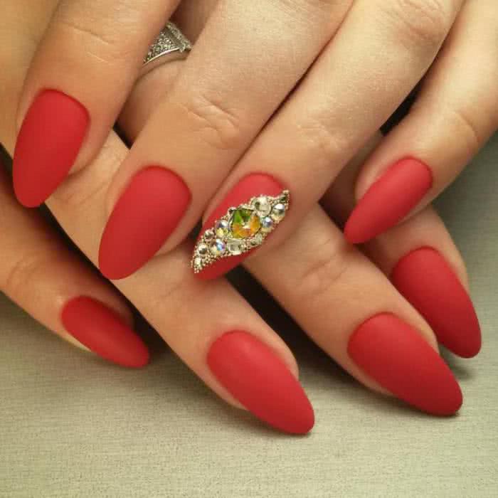 Неблестящее покрытие полюбилось многими девушками за необычность и красоту. Красные матовые ногти со стразами – это отличный способ выделить блестящие элементы, подчеркнуть женственность и элегантность хозяйки рук. Обычно такой шеллак выбирают скромные натуры, поэтому украшения используются тоже минимальные, чаще всего на нескольких пальцах.