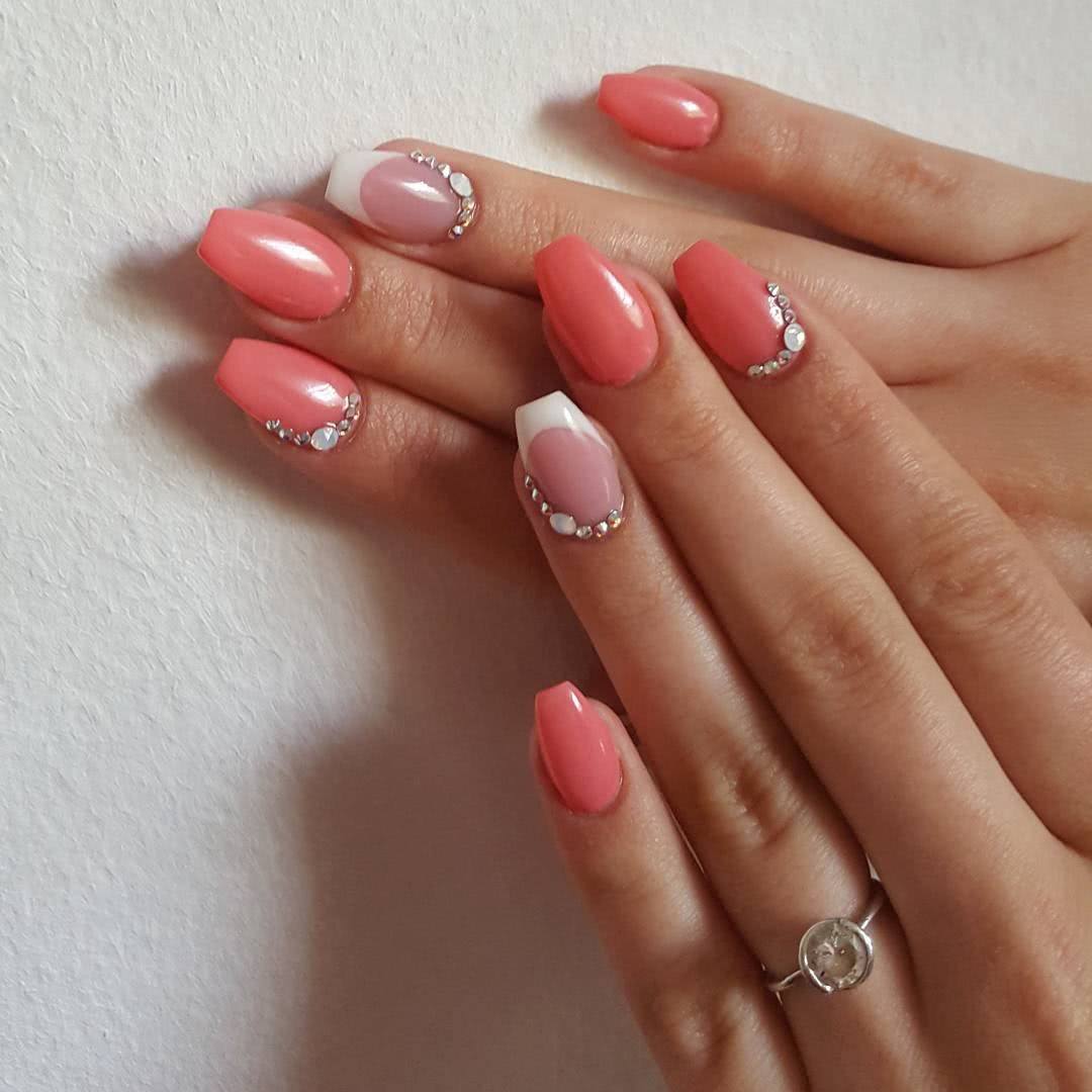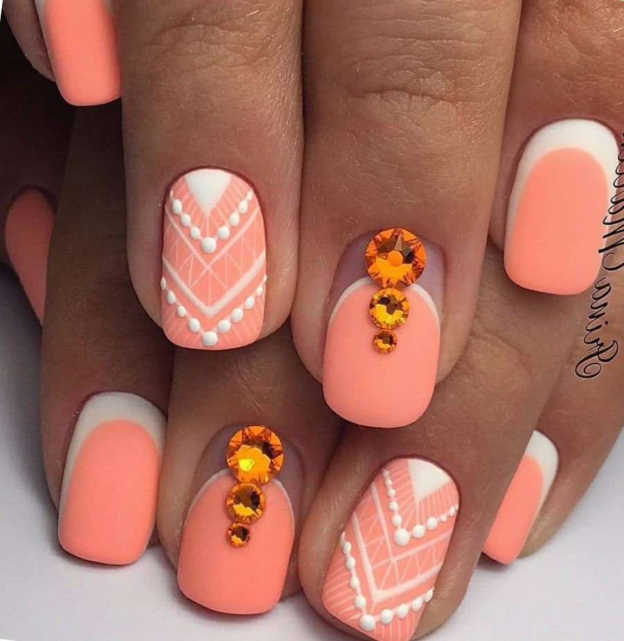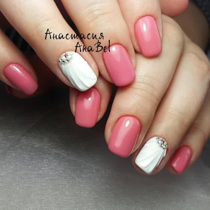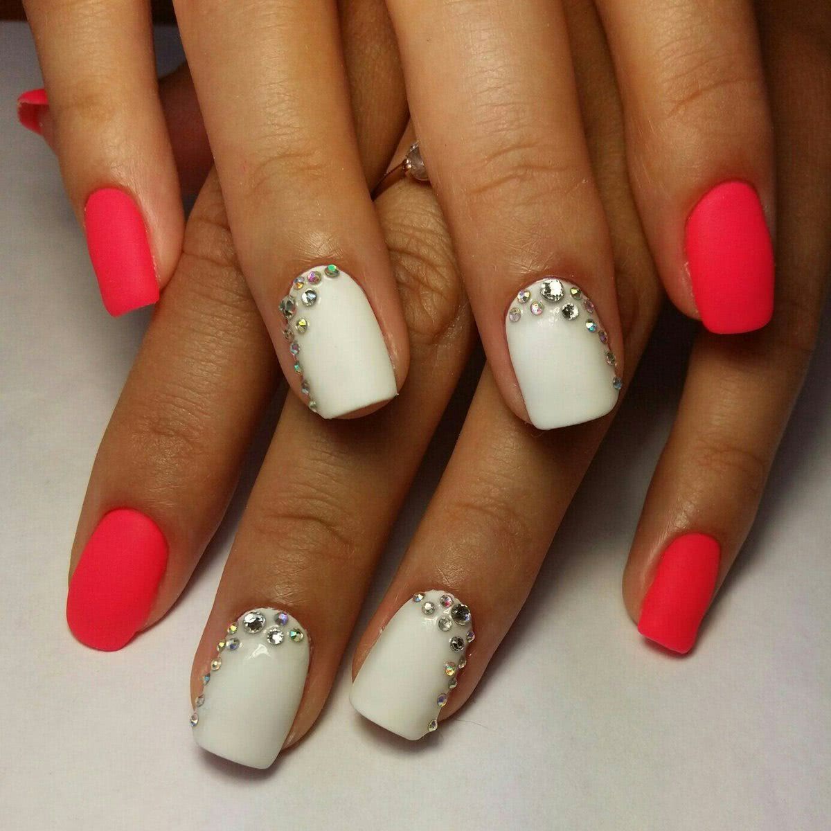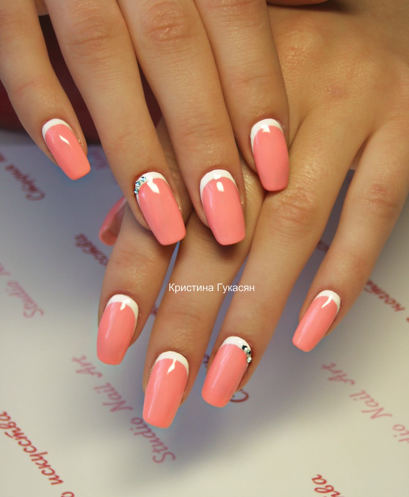 Сочетание кораллового и белого смотрится очень нежно и женственно. Мягкий коралловый оттенок дополняется безупречным белым цветом и позволяет создать десятки интересных однотонных и сложных нейл-артов. Особенно актуальна эта цветовая палитра для обладательниц коротких ногтей. Оба цвета смотрятся на коротких ногтях мягко и сдержанно. Что касается дизайна стразами, то тут можно поэкспериментировать.