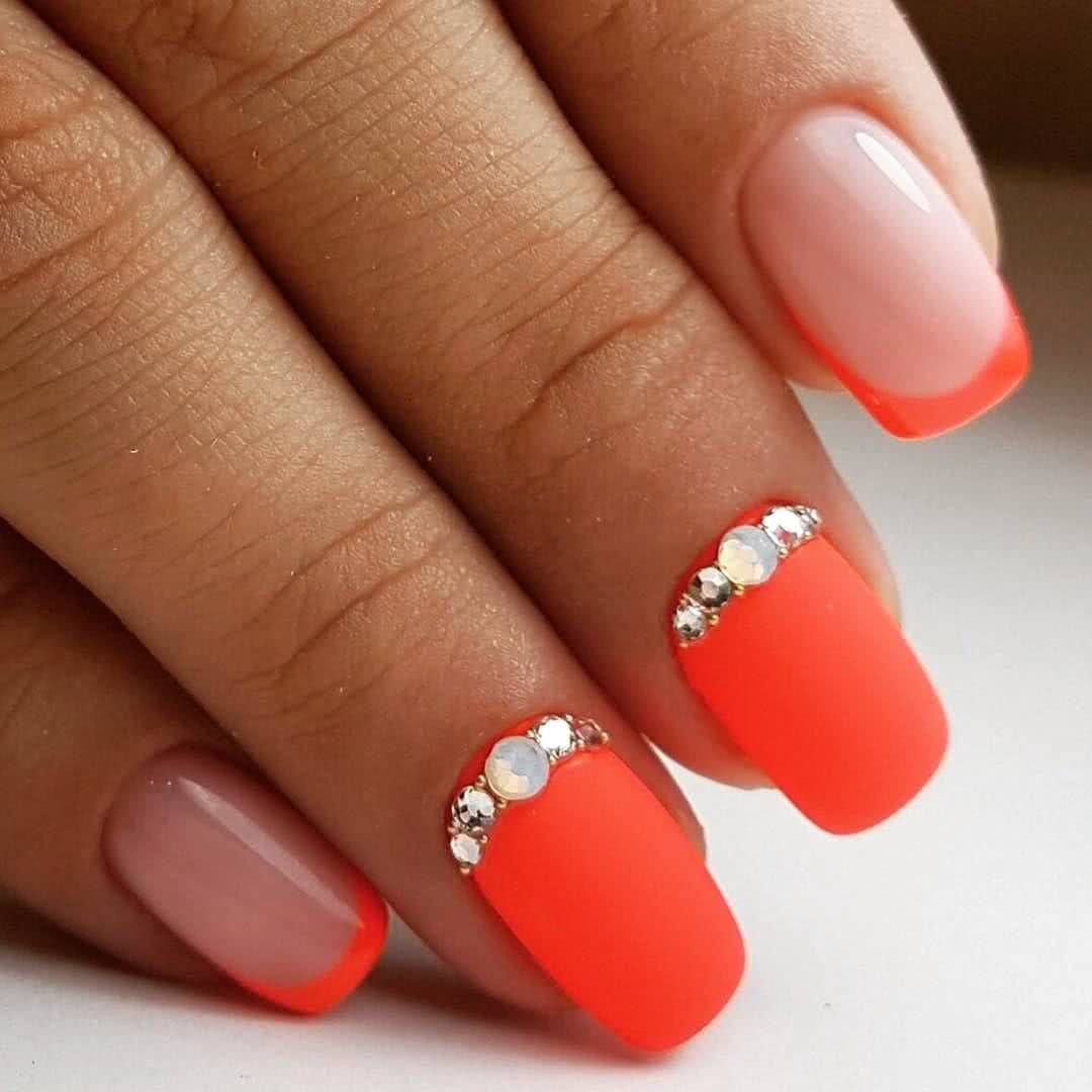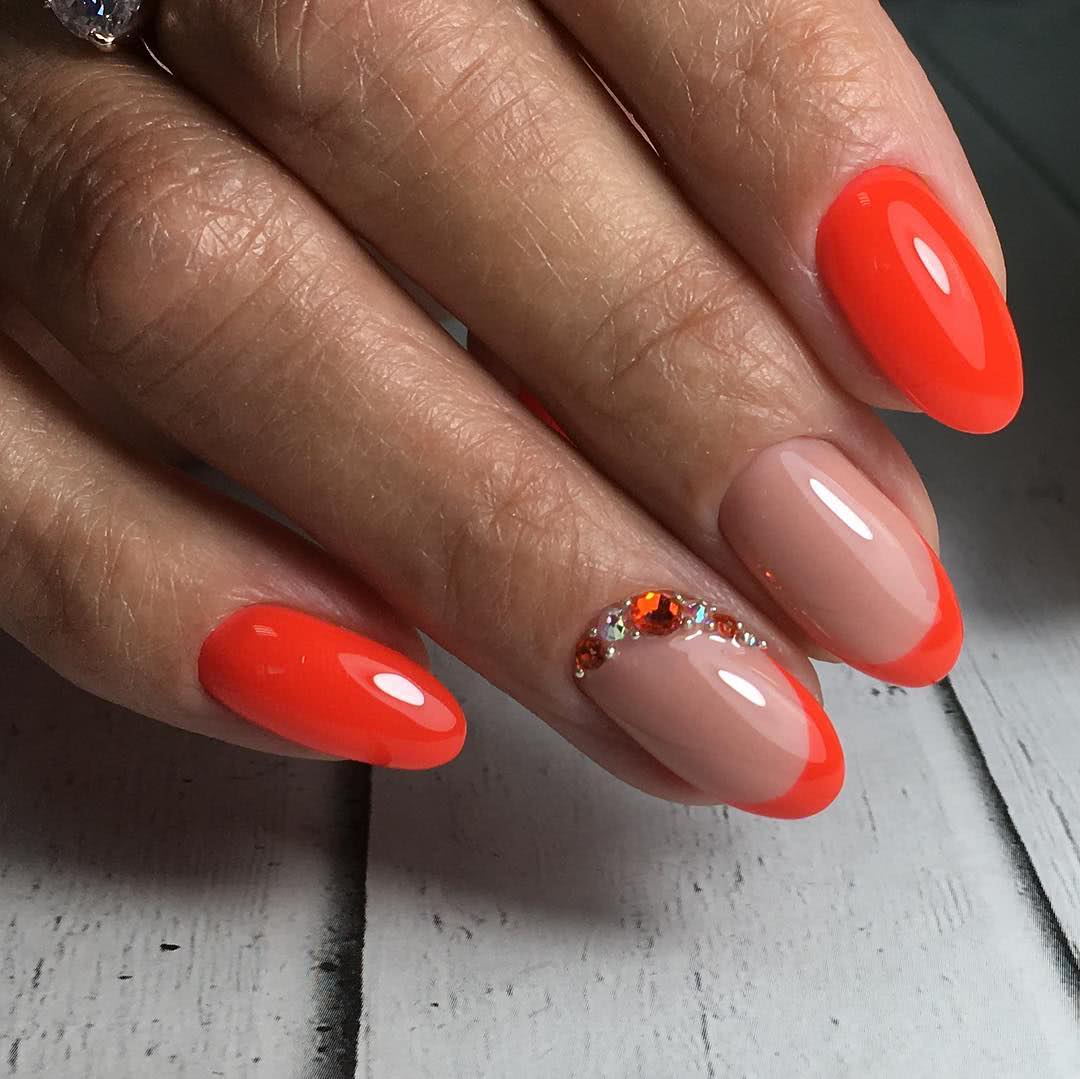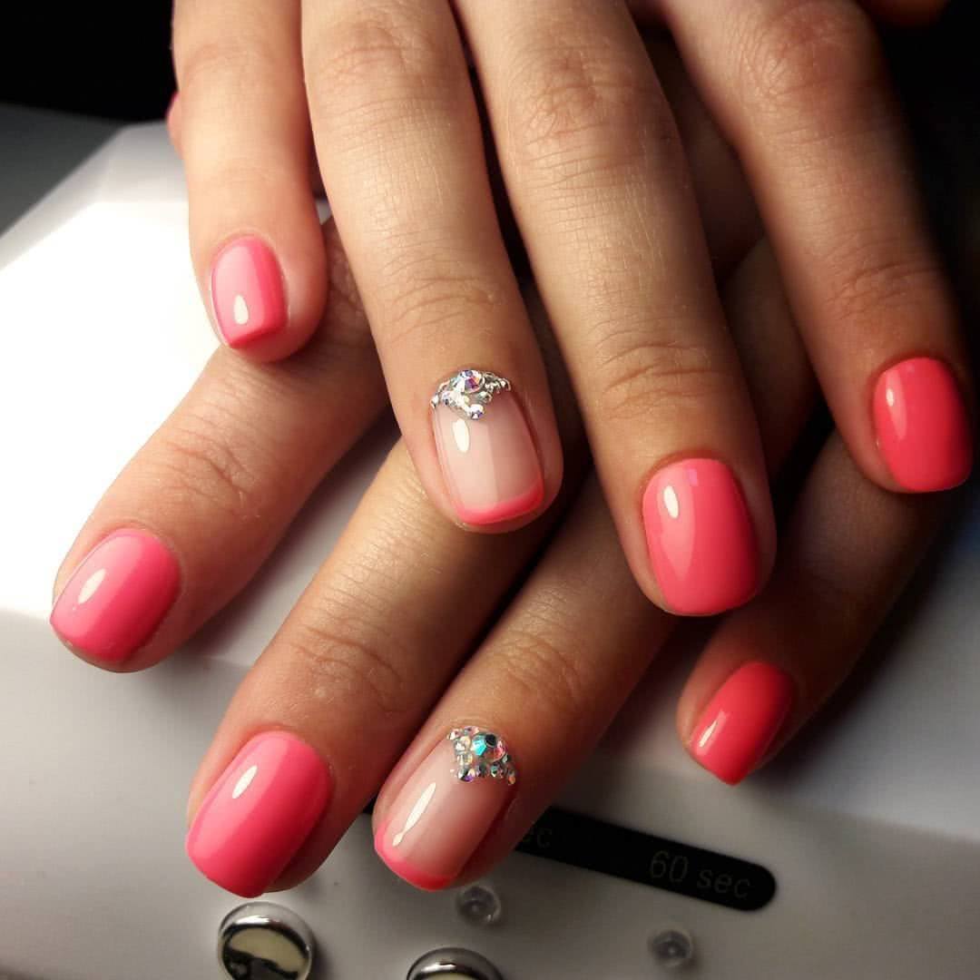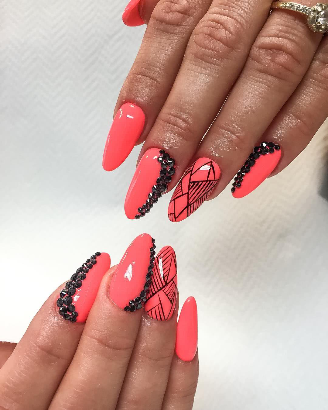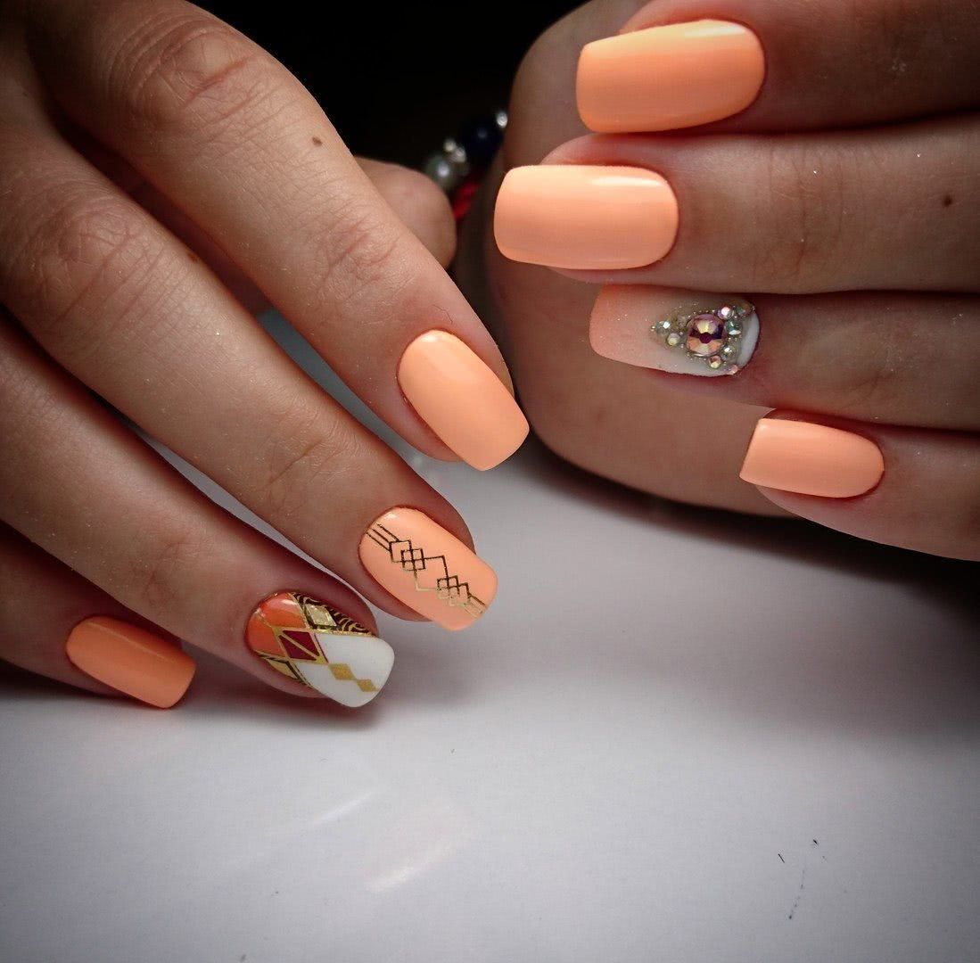 Сочетание кораллового и белого смотрится очень нежно и женственно. Мягкий коралловый оттенок дополняется безупречным белым цветом и позволяет создать десятки интересных однотонных и сложных нейл-артов. Особенно актуальна эта цветовая палитра для обладательниц коротких ногтей. Оба цвета смотрятся на коротких ногтях мягко и сдержанно. Что касается дизайна стразами, то тут можно поэкспериментировать.