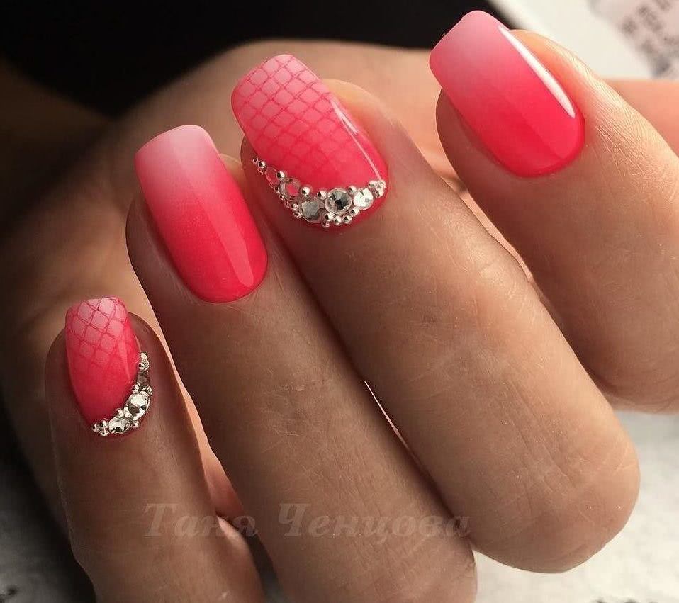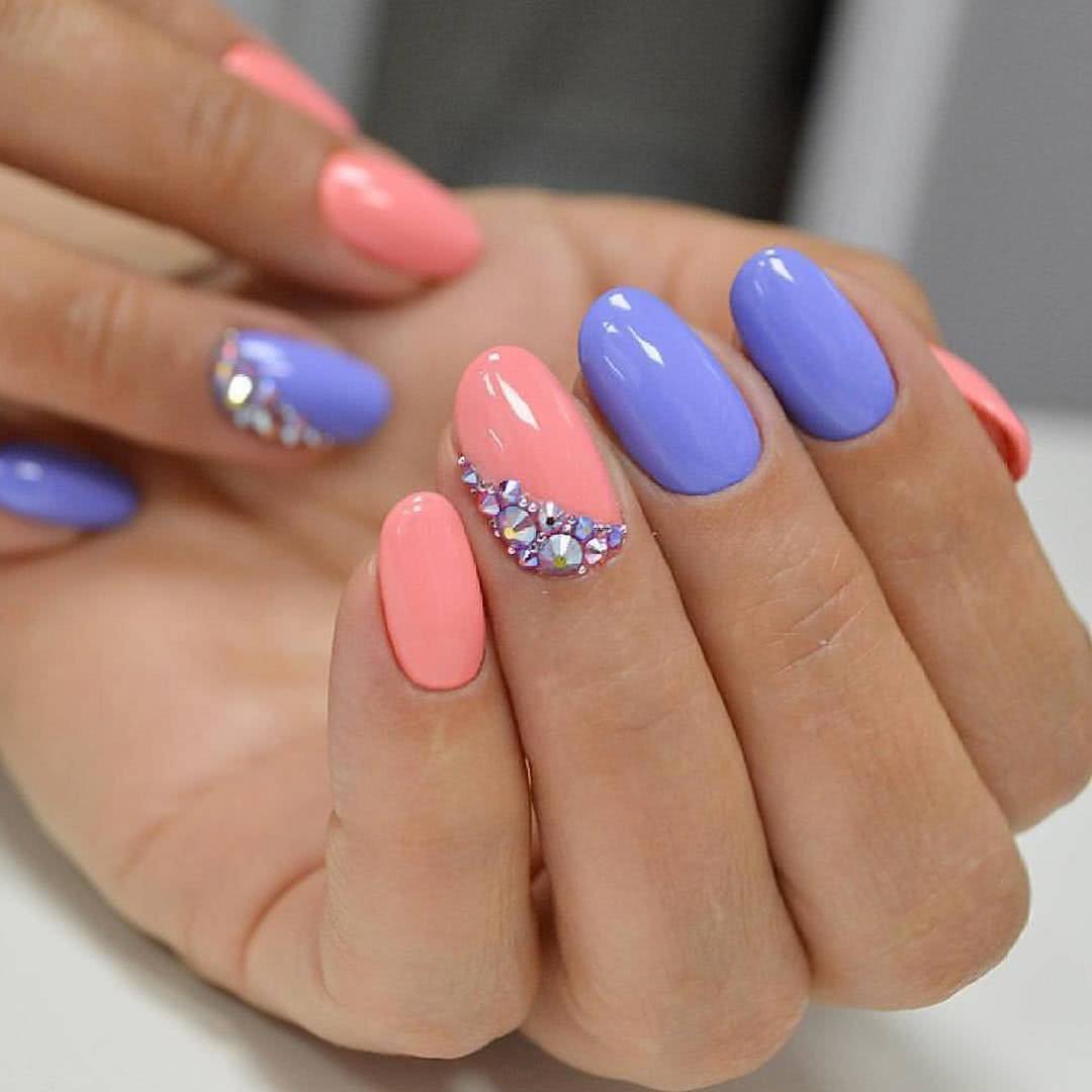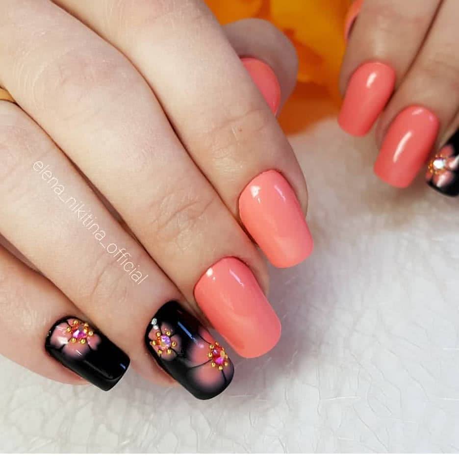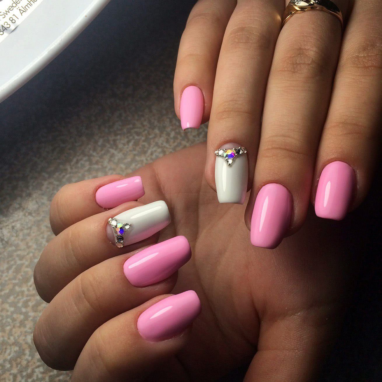 Сочетание кораллового и белого смотрится очень нежно и женственно. Мягкий коралловый оттенок дополняется безупречным белым цветом и позволяет создать десятки интересных однотонных и сложных нейл-артов. Особенно актуальна эта цветовая палитра для обладательниц коротких ногтей. Оба цвета смотрятся на коротких ногтях мягко и сдержанно. Что касается дизайна стразами, то тут можно поэкспериментировать.