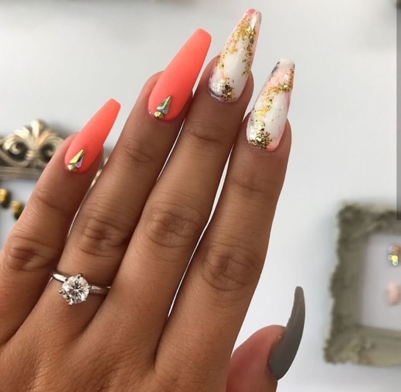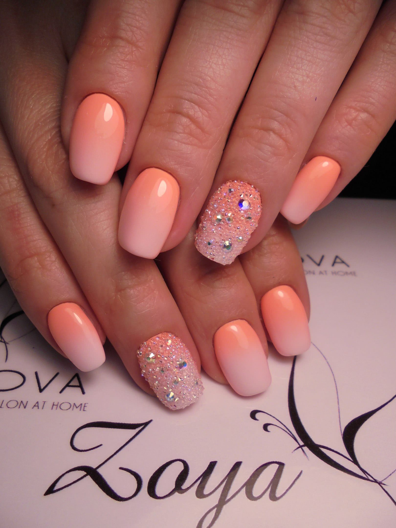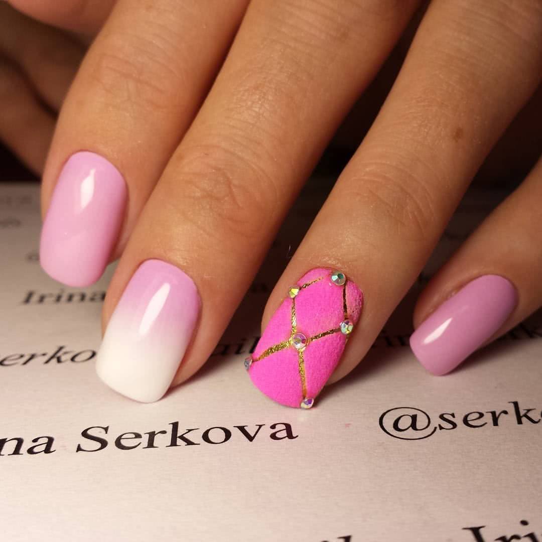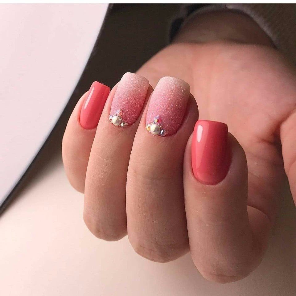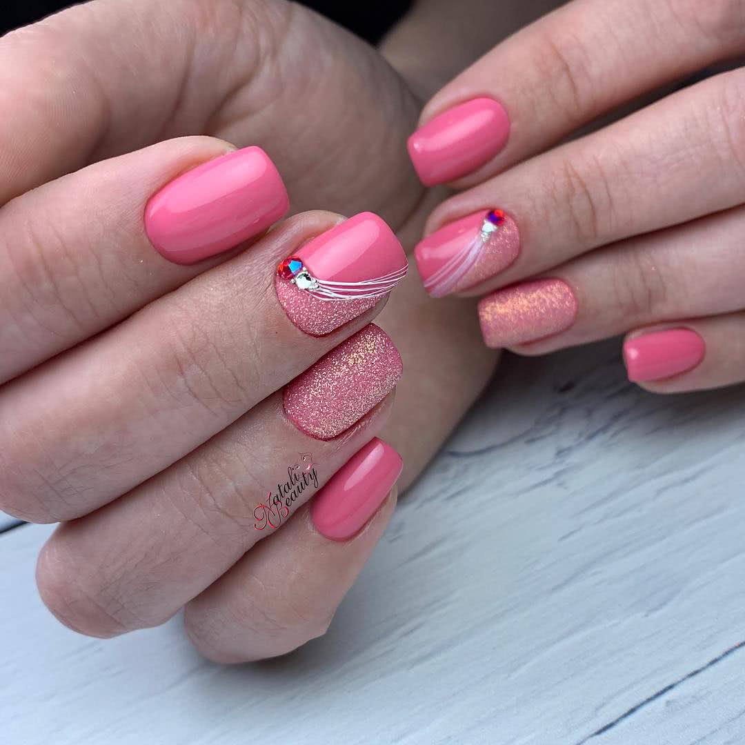 Сочетание кораллового и белого смотрится очень нежно и женственно. Мягкий коралловый оттенок дополняется безупречным белым цветом и позволяет создать десятки интересных однотонных и сложных нейл-артов. Особенно актуальна эта цветовая палитра для обладательниц коротких ногтей. Оба цвета смотрятся на коротких ногтях мягко и сдержанно. Что касается дизайна стразами, то тут можно поэкспериментировать.